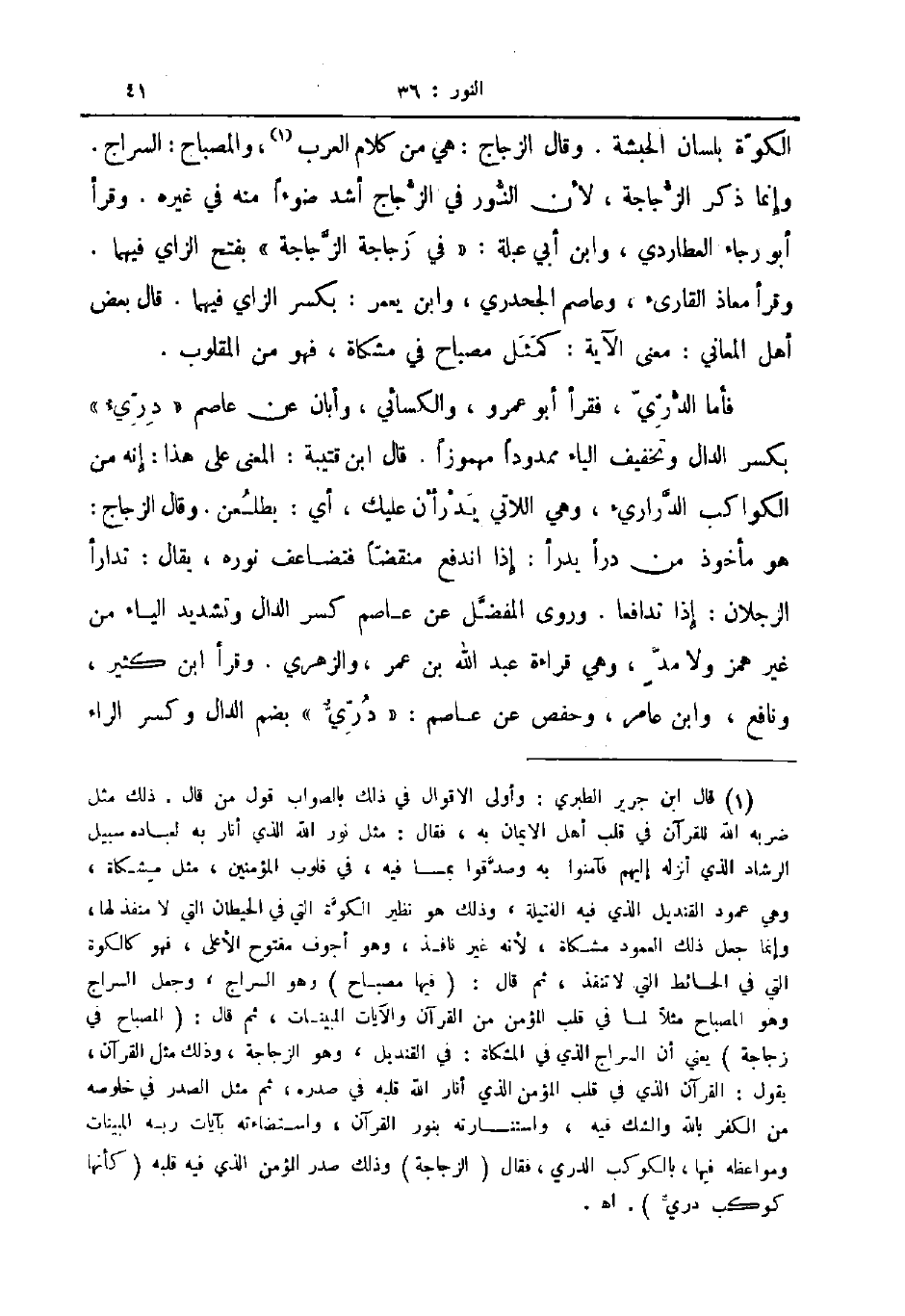 الكوة بلسان الحبشة وقال الزجاج هي من كلام العرب والمصباح السراج وإنما ذكر الزجاجة لأن النور في الزجاج أشد ضوءا منه في غيره وقرأ أبو رجاء العطاردي وابن أبي عبلة في زجاجة الزجاجة بفتح الزاي فيهما وقرأ معاذ القارئ وعاصم الجحدري وابن يعمر بكسر الزاي فيهما قال بعض أهل المعاني معنى الآية كمثل مصباح في مشكاة فهو من المقلوب