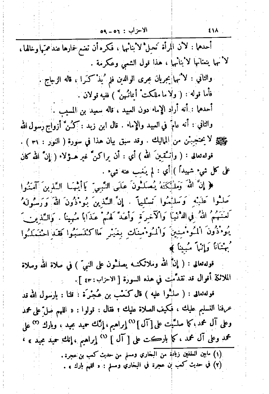 قوله تعالى صلوا عليه قال كعب بن عجرة قلنا يا رسول الله قد عرفنا التسليم عليك فكيف الصلاة عليك فقال قولوا اللهم صل على محمد وعلى آل محمد كما صليت على آل إبراهيم إنك حميد مجيد وبارك على محمد وعلى آل محمد كما باركت على آل إبراهيم إنك حميد مجيد