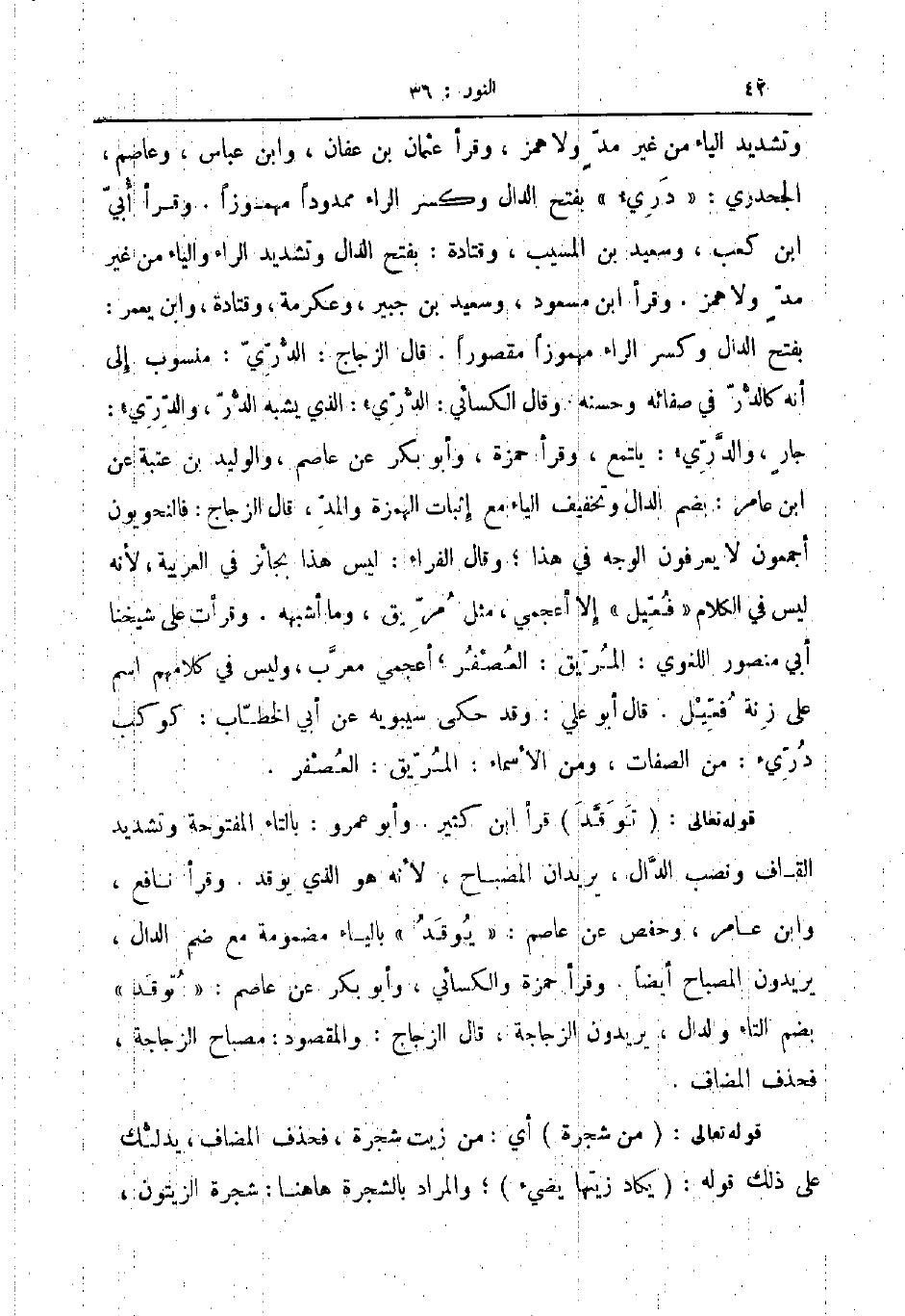 وتشديد الياء من غير مد ولا همز وقرأ عثمان بن عفان وابن عباس وعاصم الجحدري دري بفتح الدال وكسر الراء ممدودا مهموزا وقرأ أبي ابن كعب وسعيد بن المسيب وقتادة بفتح الدال وتشديد الراء والياء من غير مد ولا همز وقرأ ابن مسعود وسعيد بن جبير وعكرمة وقتادة وابن يعمر بفتح الدال وكسر الراء مهموزا مقصورا قال الزجاج الدري منسوب إلى انه كالدر في صفائه وحسنه وقال الكسائي الدري الذي يشبه الدر والدري جار والدري يلتمع وقرأ حمزة وأبو بكر عن عاصم والوليد بن عتبة عن ابن عامر بضم الدال وتخفيف الياء مع إثبات الهمزة والمد قال الزجاج فالنحويون أجمعون لا يعرفون الوجه في هذا وقال الفراء ليس هذا بجائز في العربية لأنه ليس في الكلام فعيل إلا أعجمي مثل مريق وما أشبهه وقرأت على شيخنا أبي منصور اللغوي المريق العصفر اعجمي معرب وليس في كلامهم اسم على زنة فعيل قال ابو علي وقد حكى سيبويه عن ابي الخطاب كوكب دري من الصفات ومن الاسماء المريق العصفر