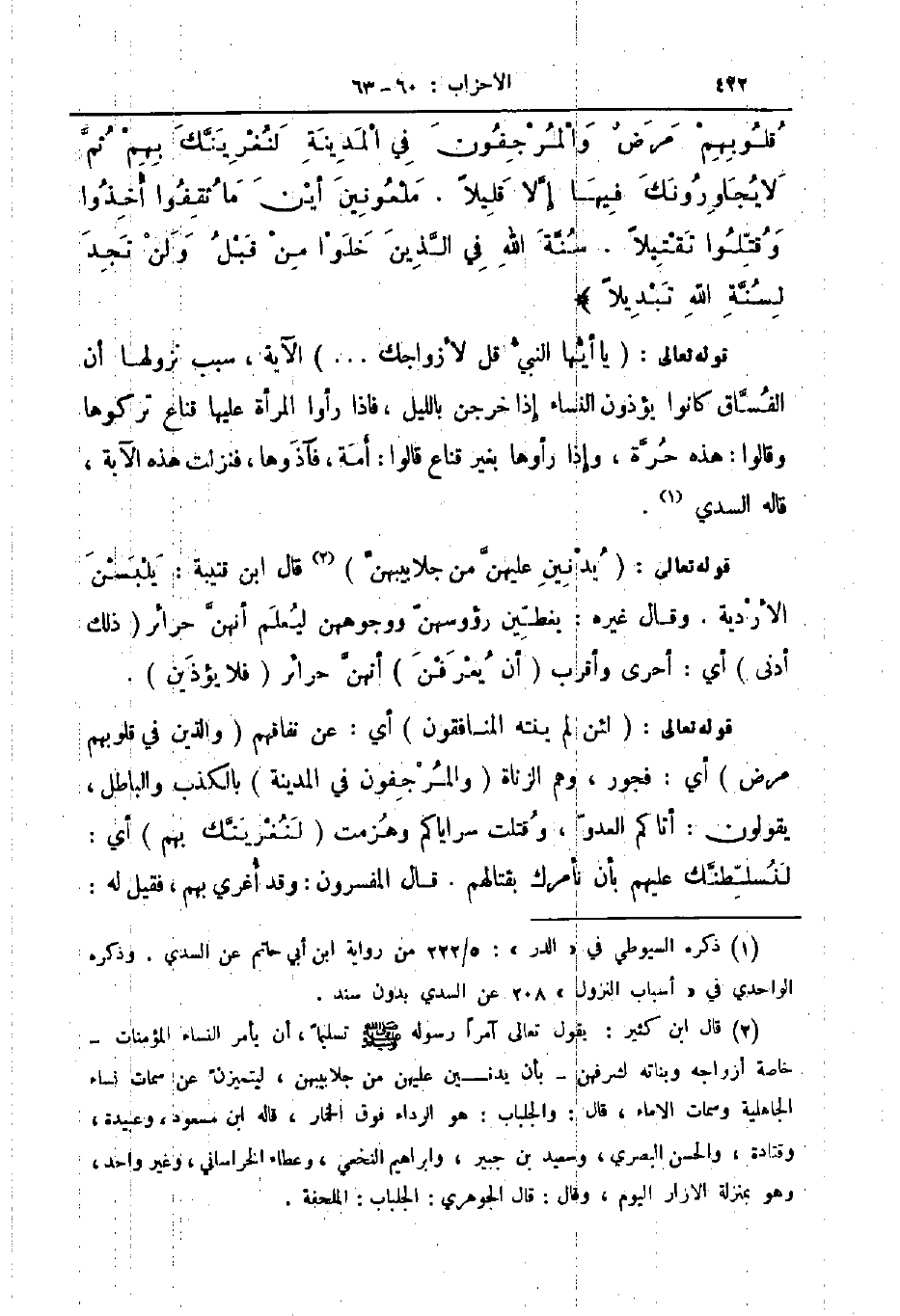 قوله تعالى يدنين عليهن من جلابيبهن قال ابن قتيبة يلبسن الأردية وقال غيره يغطين رؤوسهن ووجوهن ليعلم أنهن حرائر ذلك أدنى أي أحرى وأقرب أن يعرفن أنهن حرائر فلا يؤذين