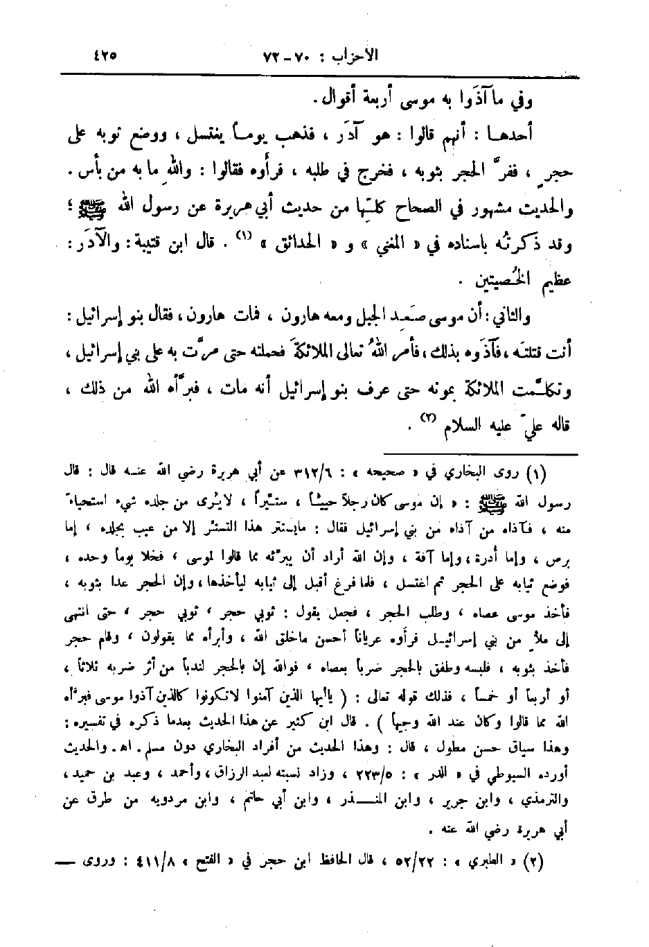 أحدها أنهم قالوا هو آدر فذهب يوما يغتسل ووضع ثوبه على حجر ففر الحجر بثوبه فخرج في طلبه فرأوه فقالوا والله ما به من بأس والحديث مشهور في الصحاح كلها من حديث ابي هريرة عن رسول الله صلى الله عليه و سلم وقد ذكرته باسناده في المغني والحدائق قال ابن قتيبة والآدر عظيم الخصيتين