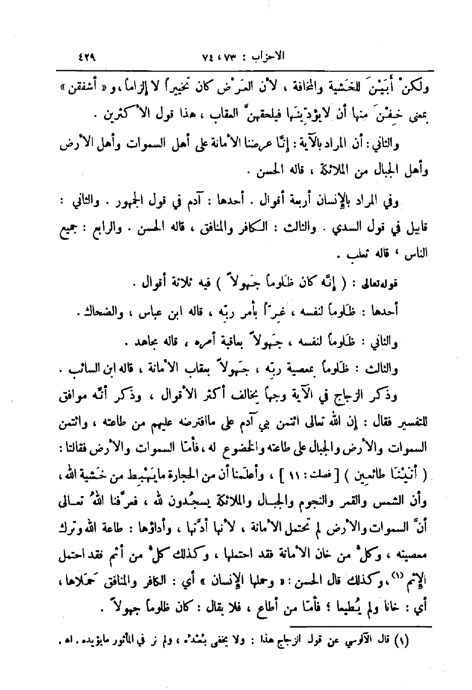 وذكر الزجاج في الآية وجها يخالف أكثر الأقوال وذكر أنه موافق للتفسير فقال إن الله تعالى ائتمن بني آدم على ما افترضه عليهم من طاعته وائتمن السماوات والأرض والجبال على طاعته والخضوع له فأما السماوات والأرض فقالتا أتينا طائعين فصلت وأعلمنا ان من الحجارة ما يهبط من خشية الله وأن الشمس والقمر والنجوم والجبال والملائكة يسجدون لله فعرفنا الله تعالى أن السماوات والأرض لم تحتمل الأمانة لأنها أدتها وأداؤها طاعة الله وترك معصيته وكل من خان الأمانة فقد احتملها وكذلك كل من أثم فقد احتمل الإثم وكذلك قال الحسن وحملها الإنسان أي الكافر والمنافق حملاها أي خانا ولم يطيعا فأما من أطاع فلا يقال كان ظلوما جهولا