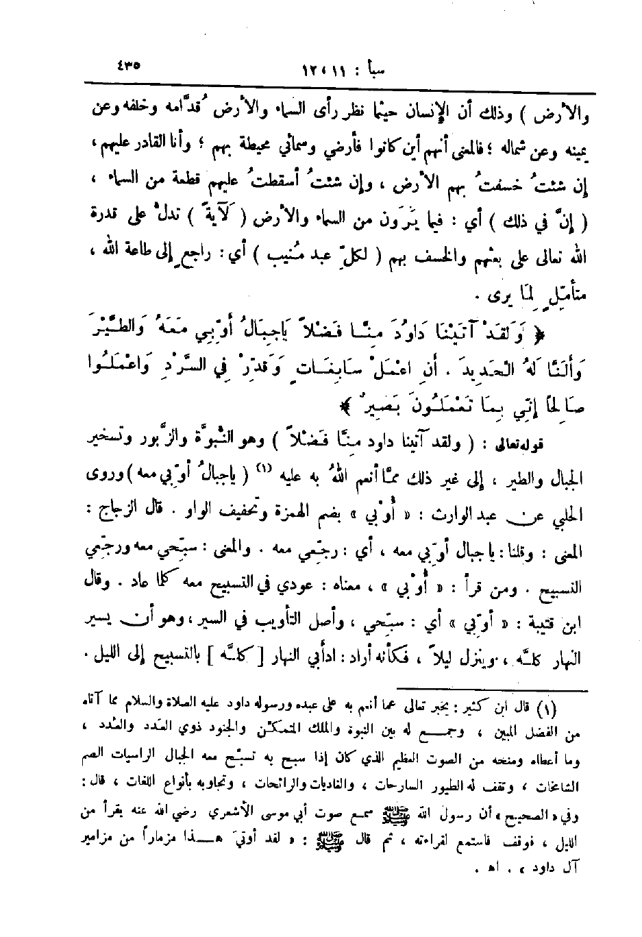 قوله تعالى ولقد آتينا داود منا فضلا وهو النبوة والزبور وتسخير الجبال والطير إلى غير ذلك مما أنعم الله به عليه يا جبال أوبي معه وروى الحلبي عن عبد الوارث أوبي بضم الهمزة وتخفيف الواو قال الزجاج المعنى وقلنا يا جبال أوبيء معه أي رجعي معه والمعنى سبحي معه ورجعي التسبيح ومن قرأ أوبي معناه عودي في التسبيح معه كلما عاد وقال ابن قتيبة أوبي أي سبحي واصل التأويب في السير وهو ان يسير النهار كله وينزل ليلا فكأنه أراد ادأبي النهار كله بالتسبيح إلى الليل