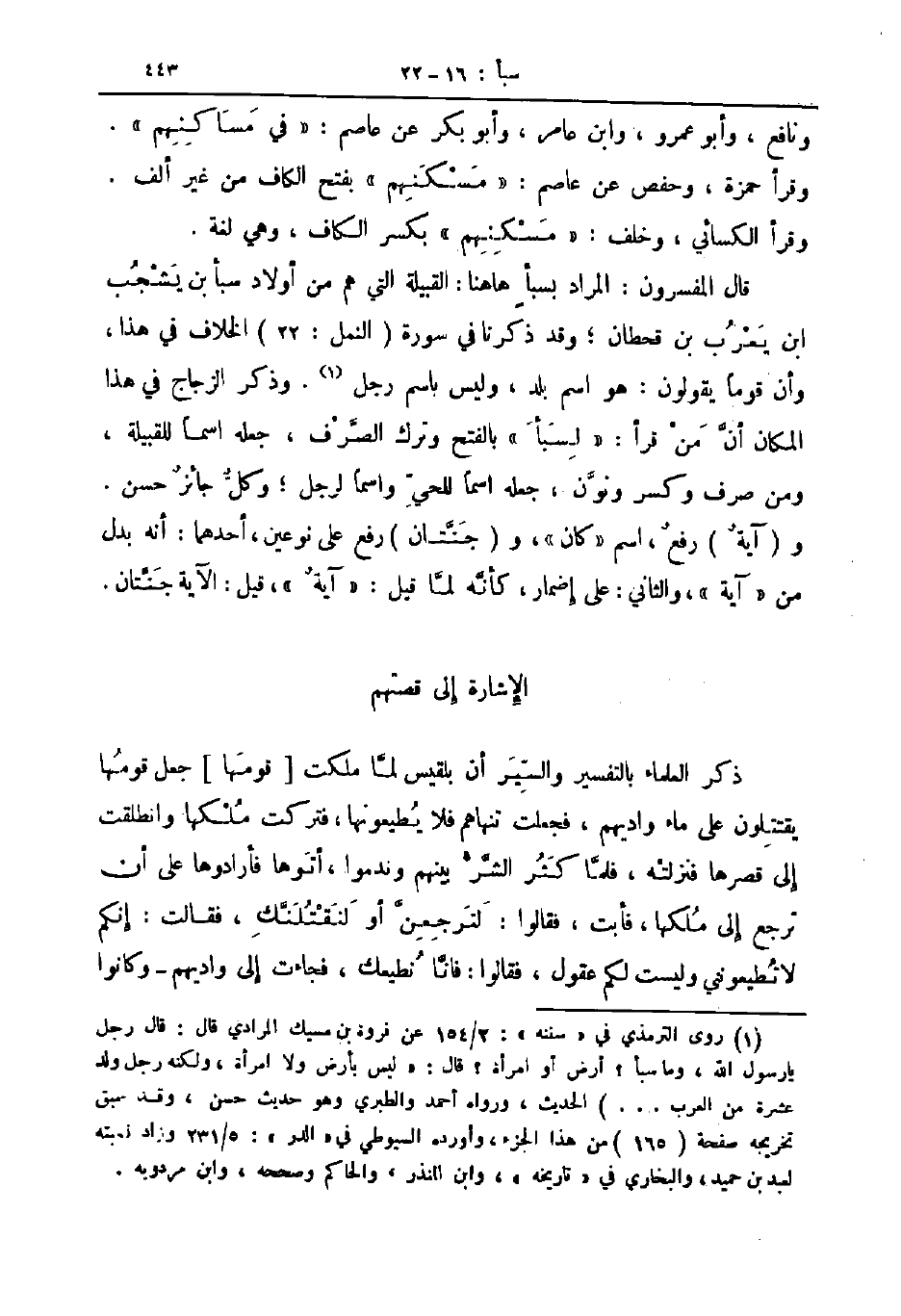 ونافع وأبو عمرو وابن عامر وأبو بكر عن عاصم في مساكنهم وقرأ حمزة وحفص عن عاصم مسكنهم بفتح الكاف من غير ألف وقرأ الكسائي وخلف مسكنهم بكسر الكاف وهي لغة