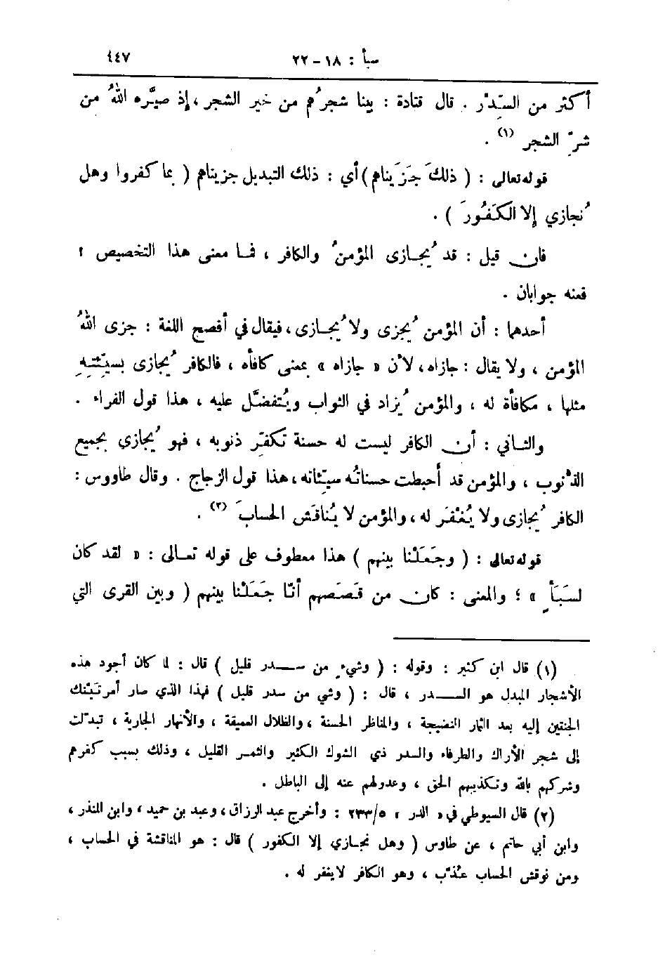 والثاني أن الكافر ليست له حسنة تكفر ذنوبه فهو يجازي بجميع الذنوب والمؤمن قد أحبطت حسناته سيئاته هذا قول الزجاج وقال طاووس الكافر يجازى ولا يغفر له والمؤمن لا يناقش الحساب