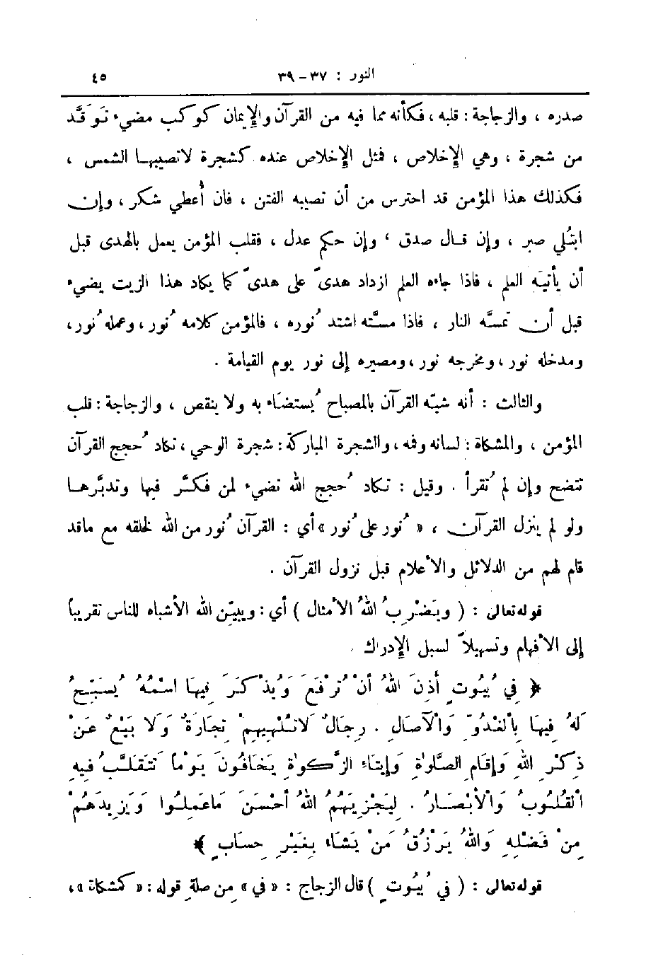 صدره والزجاجة قلبه فكأنه مما فيه من القرأن والإيمان كوكب مضئ توقد من شجرة وهي الإخلاص فمثل الإخلاص عنده كشجرة لا تصيبها الشمس فكذلك هذا المؤمن قد احترس من أن تصيبه الفتن فان اعطي شكر وإن ابتلي صبر وإن قال صدق وإن حكم عدل فقلب المؤمن يعمل بالهدى قبل أن يأتيه العلم فاذا جاءه العلم ازداد هدى على هدى كما يكاد هذا الزيت يضئ قبل أن تمسه النار فاذا مسته ا شتد نوره فالمؤمن كلامه نور وعمله نور ومدخله نور ومخرجه نور ومصيره إلى نور يوم القيامة