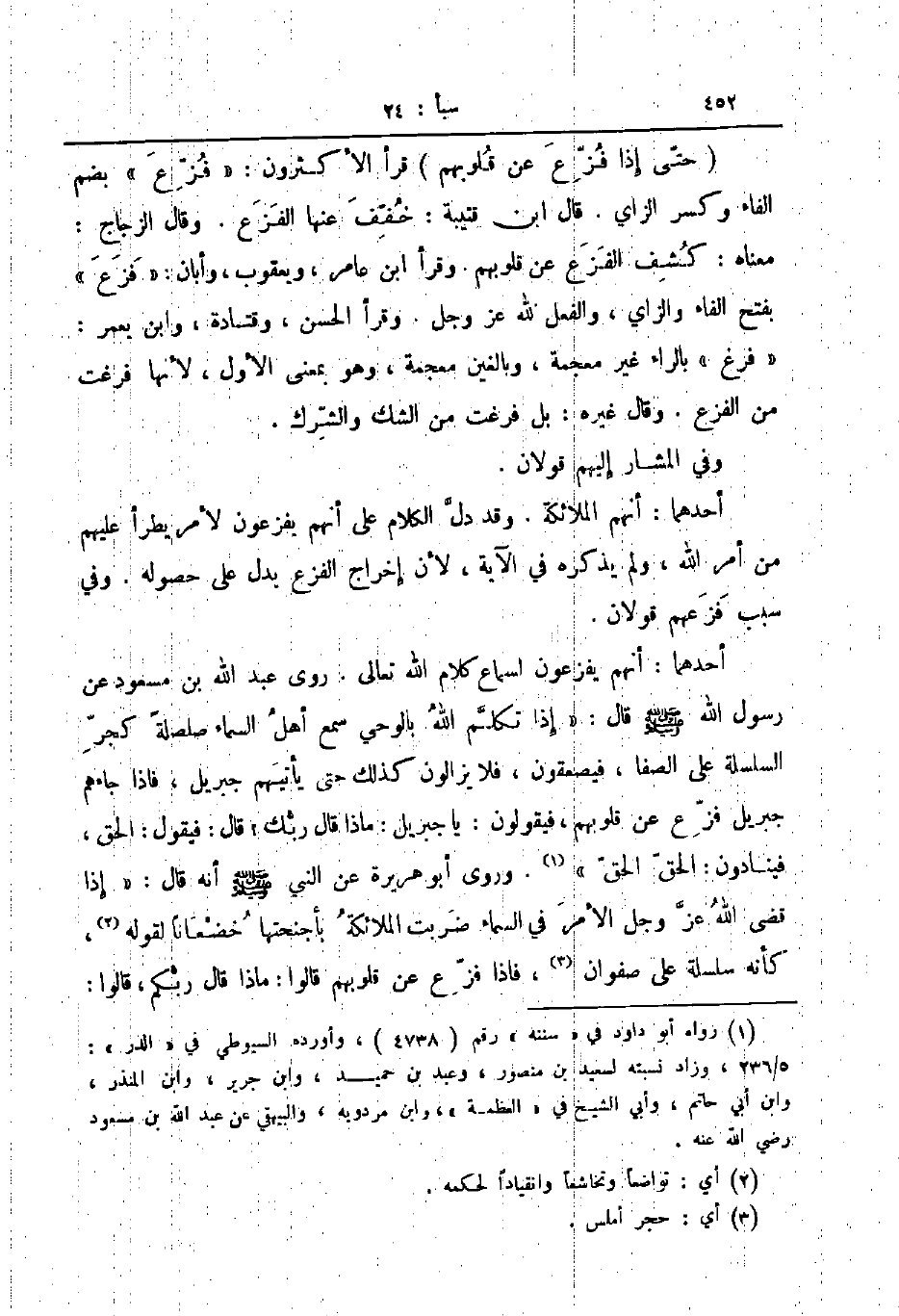 حتى إذا فزع عن قلوبهم قرأ الأكثرون فزع بضم الفاء وكسر الزاي قال ابن قتيبة خفف عنها الفزع وقال الزجاج معناه كشف الفزع عن قلوبهم وقرأ ابن عامر ويعقوب وأبان فزع بفتح الفاء والزاي والفعل لله عز و جل وقرأ الحسن وقتادة وابن يعمر فرغ بالراء غير معجمة وبالغين معجمة وهو بمعنى الأول لأنها فرغت من الفزع وقال غيره بل فرغت من الشك والشرك