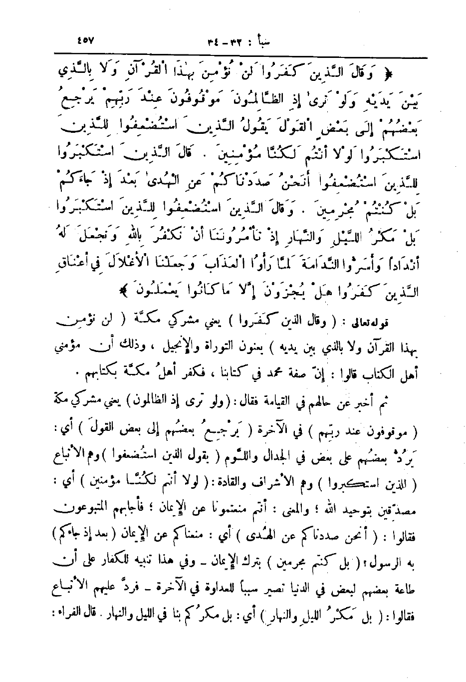 وقال الذين كفروا لن نؤمن بهذا القرآن ولا بالذي بين يديه ولو ترى إذ الظالمون موقوفون عند ربهم يرجع بعضهم إلى بعض القول يقول الذين استضعفوا للذين استكبروا لولا أنتم لكنا مؤمنين قال الذين استكبروا للذين استضعفوا أنحن صددناكم عن الهدى بعد إذ جاءكم بل كنتم مجرمين وقال الذين استضعفوا للذين استكبروا بل مكر الليل والنهار إذ تأمروننا أن نكفر بالله ونجعل له أندادا وأسروا الندامة لما رأوا العذاب وجعلنا الأغلال في أعناق الذين كفروا هل يجزون إلا ما كانو يعملون