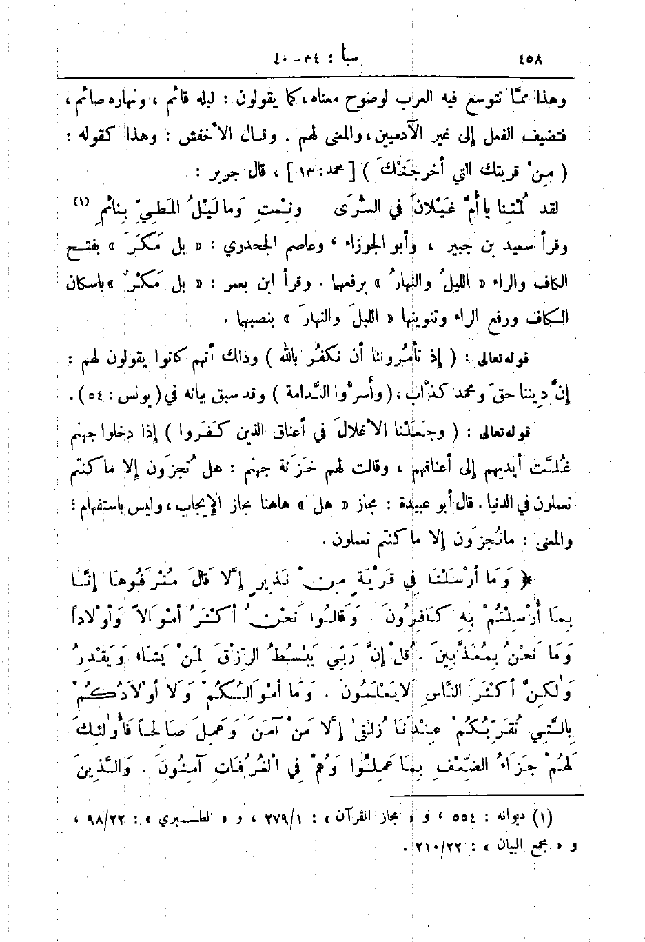 قوله تعالى وجعلنا الأغلال في أعناق الذين كفروا إذا دخلوا جهنم غلت أيديهم إلى أعناقهم وقالت لهم خزنة جهنم هل تجزون إلا ما كنتم تعملون في الدنيا قال ابو عبيدة مجاز هل هاهنا مجاز الإيجاب وليس باستفهام والمعنى ما تجزون إلا ما كنتم تعملون وما أرسلنا في قرية من نذير إلا قال مترفوها إنا بما أرسلتم به كافرون وقالوا نحن أكثر أموالا وأولادا وما نحن بمعذبين قل إن ربي يبسط الرزق لمن يشاء ويقدر ولكن أكثر الناس لا يعلمون وما أموالكم ولا أولادكم بالتي تقربكم عندنا زلفى إلا من آمن وعمل صالحا فأولئك لهم جزاء الضعف بما عملوا وهم في الغرفات آمنون والذين