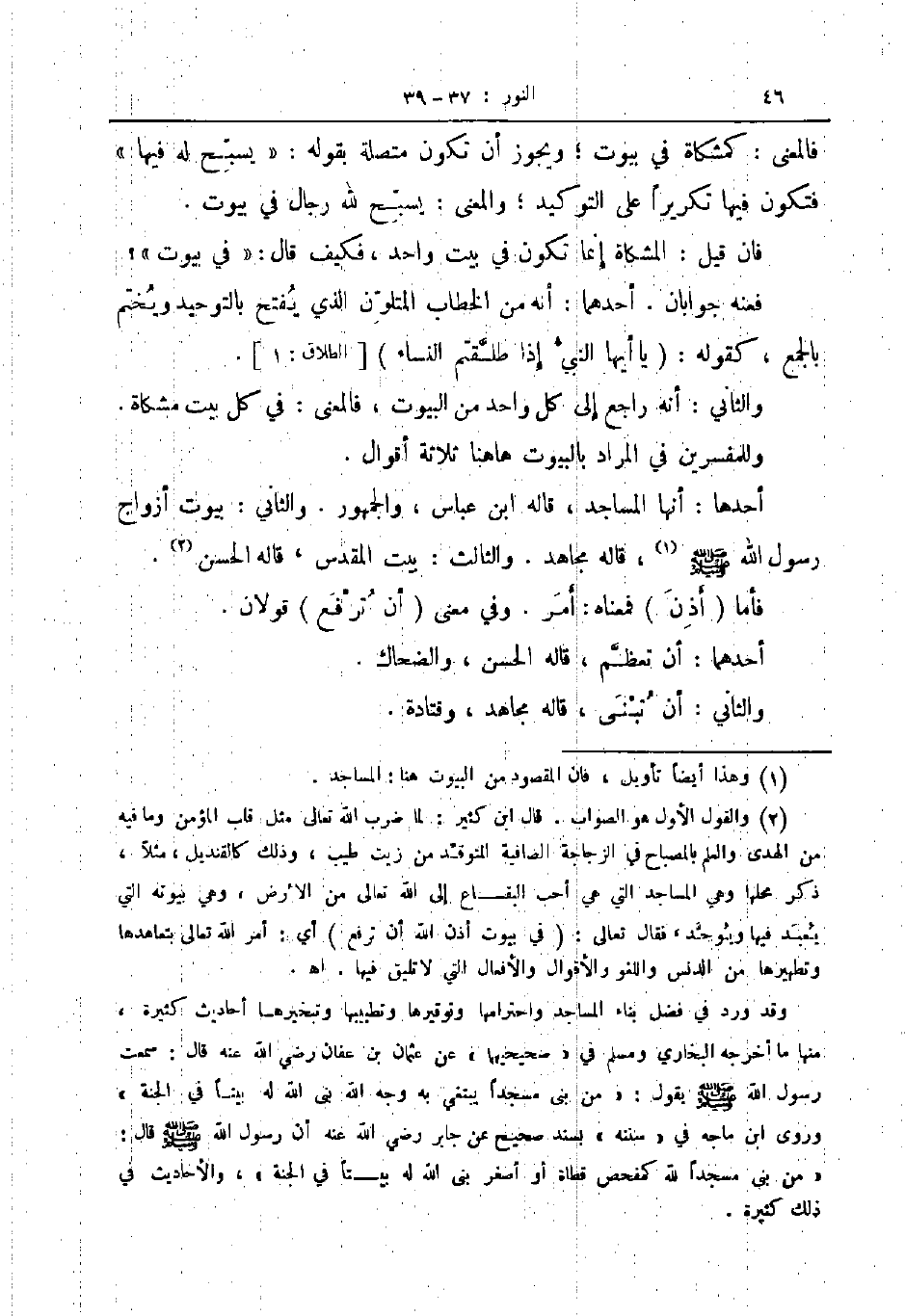 والثاني أنه راجع إلى كل واحد من البيوت فالمعنى في كل بيت مشكاة وللمفسرين في المراد بالبيوت ها هنا ثلاثة أقوال