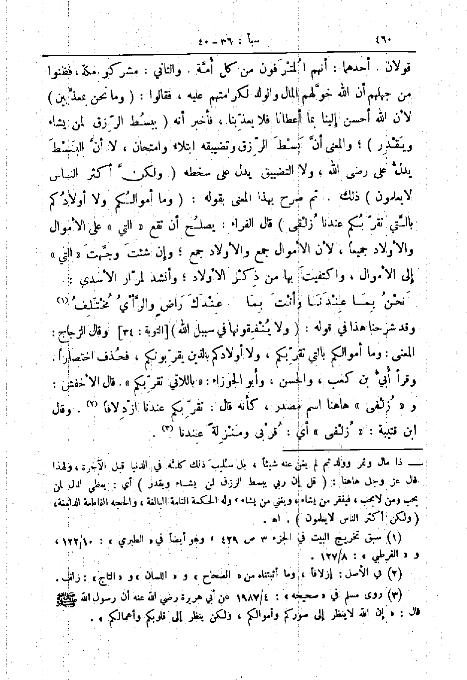 قولان أحدهما أنهم المترفون من كل أمة والثاني مشركو مكة فظنوا من جهلهم أن الله خولهم المال والولد لكرامتهم عليه فقالوا وما نحن بمعذبين لأن الله أحسن إلينا بما أعطانا فلا يعذبنا فأخبر أنه يبسط الرزق لمن يشاء ويقدر والمعنى أن بسط الرزق وتضييقه ابتلاء وامتحان لا أن البسط يدل على رضى الله ولا التضييق يدل على سخطه ولكن أكثر الناس لا يعلمون ذلك ثم صرح بهذا المعنى بقوله وما اموالكم ولا أولادكم بالتي تقربكم عندنا زلفى قال الفراء يصلح أن تقع التي على الأموال والأولاد جميعا لأن الأموال جمع والأولاد جمع وإن شئت وجهت التي إلى الأموال واكتفيت بها من ذكر الأولاد وأنشد لمرار الأسدي ... نحن بما عندنا وأنت بما عندك راض والرأي مختلف ...