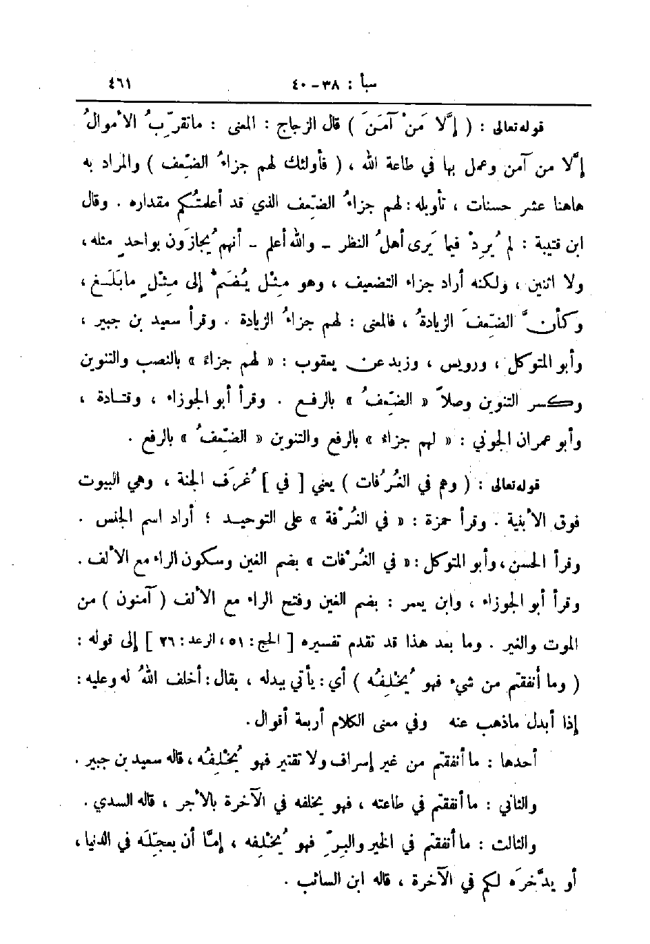 قوله تعالى إلا من آمن قال الزجاج المعنى ما تقرب الأموال إلا من آمن وعمل بها في طاعة الله فأولئك لهم جزاء الضعف والمراد به ها هنا عشر حسنات تأويله لهم جزاء الضعف الذي قد أعلمتكم مقداره وقال ابن قتيبة لم يرد فيما يرى أهل النظر والله اعلم أنهم يجازون بواحد مثله ولا اثنين ولكنه أراد جزاء التضعيف وهو مثل يضم إلى مثل ما بلغ وكأن الضعف الزيادة فالمعنى لهم جزاء الزيادة وقرأ سعيد بن جبير وأبو المتوكل ورويس وزيد عن يعقوب لهم جزاء بالنصب والتنوين وكسر التنوين وصلا الضعف بالرفع وقرأ أبو الجوزاء وقتادة وأبو عمران الجوني لهم جزاء بالرفع والتنوين الضعف بالرفع