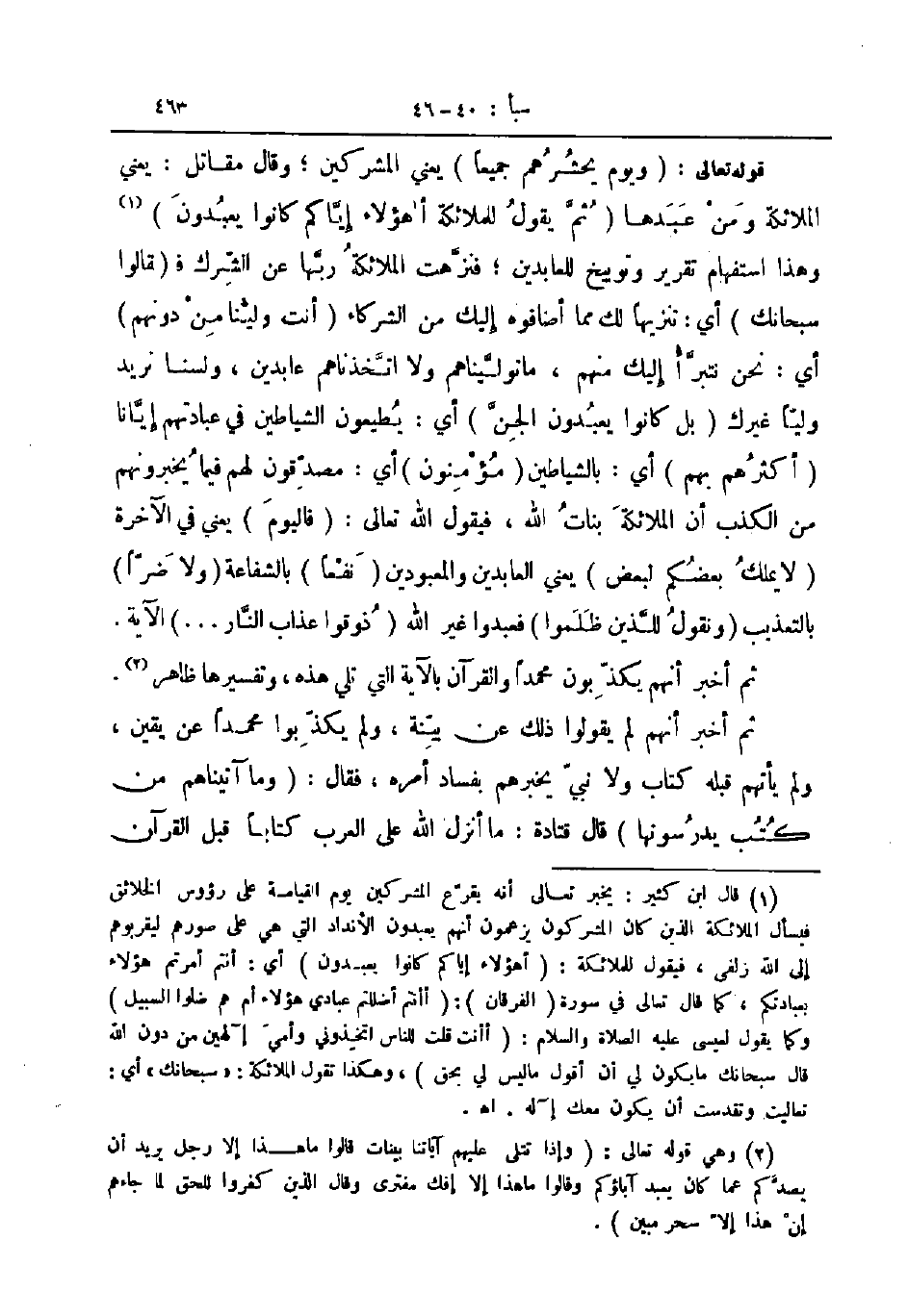 قوله تعالى ويوم يحشرهم جميعا يعني المشركين وقال مقاتل يعني الملائكة ومن عبدها ثم يقول للملائكة أهؤلاء إياكم كانوا يعبدون وهذا استفهام تقرير وتوبيخ للعابدين فنزهت الملائكة ربها عن الشرك فقالوا سبحانك أي تنزيها لك مما أضافوه إليك من الشركاء أنت ولينا من دونهم أي نحن نتبرأ إليك منهم ما تولينا ولا اتخذناهم عابدين ولسنا نريد وليا غيرك بل كانوا يعبدون الجن أي يطيعون الشياطين في عبادتهم إيانا أكثرهم بهم أي بالشياطين مؤمنون أي مصدقون لهم فيما يخبرونهم من الكذب أن الملائكة بنات الله فيقول الله تعالى فاليوم يعني في الآخرة لا يملك بعضكم لبعض يعني العابدين والمعبودين نفعا بالشفاعة ولا ضرا بالتعذيب ونقول للذين ظلموا فعبدوا غير الله ذوقوا عذاب النار الآية