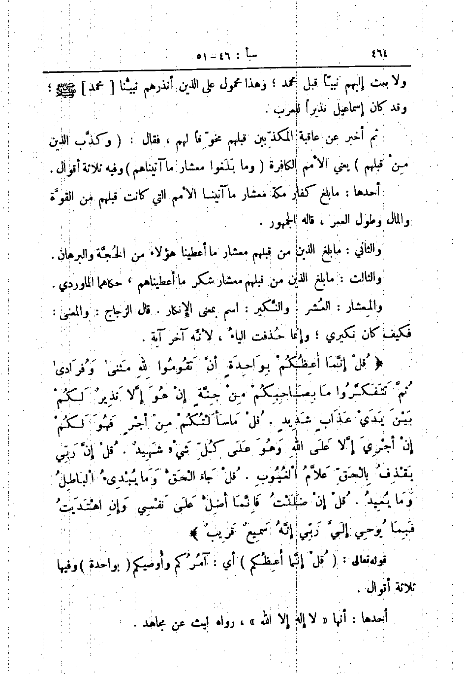 والمعشار العشر والنكير اسم بمعنى الإنكار قال الزجاج والمعنى فكيف كان نكيري وإنما حذفت الياء لأنه آخر آية قل إنما أعظكم بواحدة أن تقوموا لله مثنى وفرادى ثم تتفكروا ما بصاحبكم من جنة إن هو إلا نذير لكم بين يدي عذاب شديد قل ماسألتكم من أجر فهو لكم إن أجري إلا على الله وهو على كل شئ شهيد قل إن ربي يقذف بالحق علام الغيوب قل جاء الحق وما يبدئ الباطل وما يعيد قل إن ضللت فانما أضل على نفسي وإن اهتديت فبما يوحي إلي ربي إنه سميع قريب