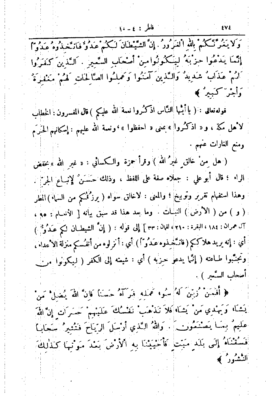 هل من خالق غير الله وقرأ حمزة والكسائي غير الله بخفض الراء قال أبو علي جعلاه صفة على اللفظ وذلك حسن لإتباع الجر وهذا استفهام تقرير وتوبيخ والمعنى لا خالق سواه يرزقكم من السماء المطر و من الأرض النبات وما بعد هذا قد سبق بيانه الأنعام آل عمران البقرة لقمان إلى قوله إن الشيطان لكم عدو أي إنه يريد هلاككم فاتخذوه عدوا أي أنزلوه من أنفسكم منزلة الأعداء وتجنبوا طاعته إنما يدعو حزبه أي شيعته إلى الكفر ليكونوا من أصحاب السعير أفمن زين له سوء عمله فرآه حسنا فان الله يضل من يشاء ويهدي من يشاء فلا تذهب نفسك عليهم حسرات إن الله عليم بما يصنعون والله الذي أرسل الرياح فتثير سحابا فسقناه إلى بلد ميت فأحيينا به الأرض بعد موتها كذلك النشور