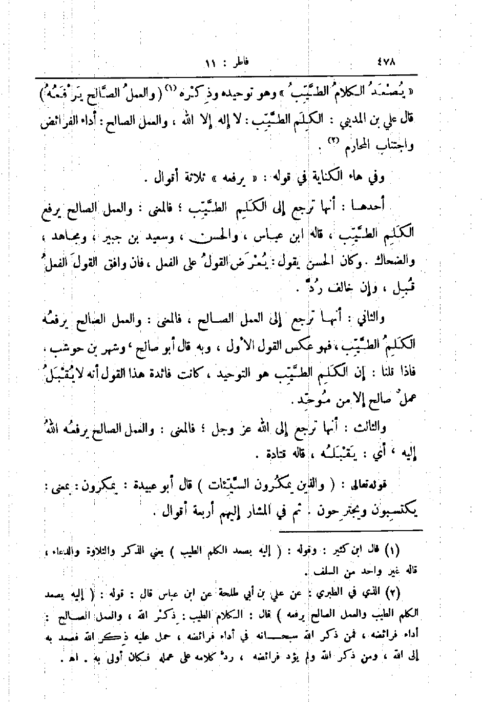 والثاني أنها ترجع إلى العمل الصالح فالمعنى والعمل الصالح يرفعه الكلم الطيب فهو عكس القول الأول وبه قال أبو صالح وشهر بن حوشب فاذا قلنا إن الكلم الطيب هو التوحيد كانت فائدة هذا القول أنه لا يقبل عمل صالح إلا من موحد