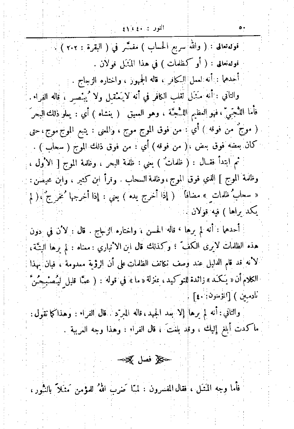 ثم ابتدأ فقال ظلمات يعني ظلمة البحر وظلمة الموج الأول وظلمة الموج الذي فوق الموج وظلمة السحاب وقرأ ابن كثير وابن محيصن سحاب ظلمات مضافا إذا أخرج يده يعني إذا أخرجها مخرج لم يكد يراها فيه قولان