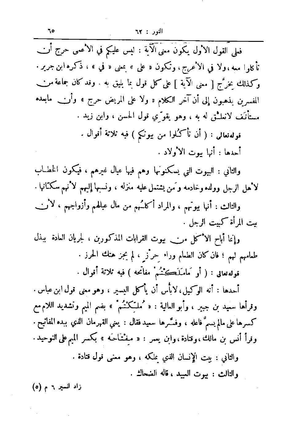 فعلى القول الأول يكون معنى الآية ليس عليكم في الاعمى حرج أن تأكلوا معه ولا في الأعرج وتكون على بمعنى في ذكره ابن جرير وكذلك يخرج معنى الآية على كل قول بما يليق به وقد كان جماعة من المفسرين يذهبون إلى أن آخر الكلام ولا على المريض حرج وأن ما بعده مستأنف لا تعلق له به وهو يقوي قول الحسن وابن زيد