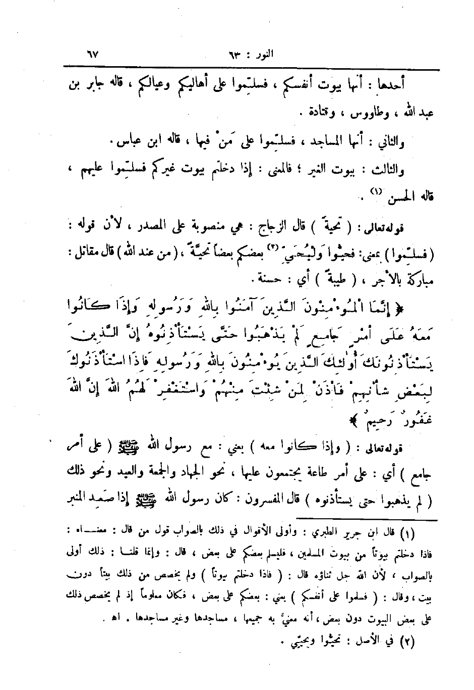 قوله تعالى تحية قال الزجاج هي منصوبة على المصدر لأن قوله فسلموا بمعنى فحيوا وليحي بعضكم بعضا تحية من عند الله قال مقاتل مباركة بالاجر طيبة أي حسنة إنما المؤمنون الذين آمنوا بالله ورسوله وإذا كانوا معه على أمر جامع لم يذهبوا حتى يستأذنوه إن الذين يستأذنونك أولئك الذين يؤمنون بالله ورسوله فإذا استأذنوك لبعض شأنهم فاذن لمن شئت منهم واستغفر لهم الله إن الله غفور رحيم قوله تعالى وإذا كانوا معه يعني مع رسول الله ص على أمر جامع أي على أمر طاعة يجتمعون عليها نحو الجهاد والجمعة والعيد ونحو ذلك لم يذهبوا حتى يستاذنوه قال المفسرون كان رسول الله ص إذا صعد المنبر