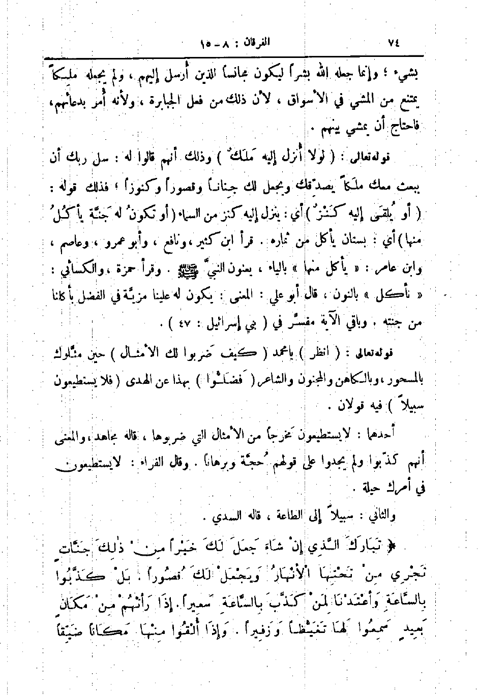 والثاني سبيلا إلى الطاعة قاله السدي تبارك الذي إن شاء جعل لك خيرا من ذلك جنات تجري من تحتها الانهار ويجعل لك قصورا بل كذبوا بالساعة وأعتدنا لمن كذب بالساعة سعيرا إذا رأتهم من مكان بعيد سمعوا لها تغيظا وزفيرا وإذا ألقوا منها مكانا ضيقا