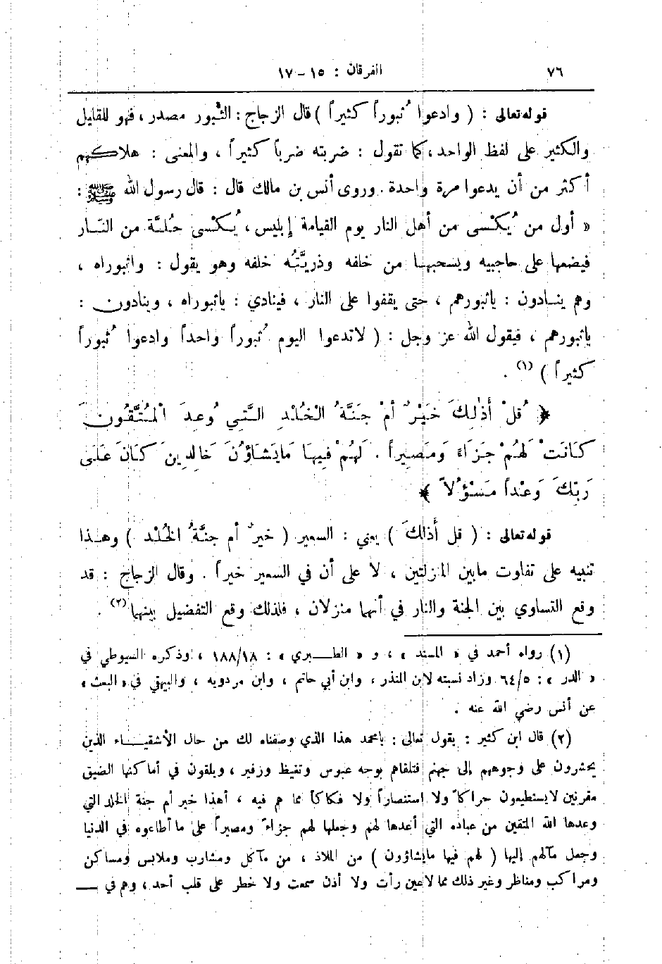 قوله تعالى وادعوا ثبورا كثيرا قال الزجاج الثبور مصدر فهو للقليل والكثير على لفظ الواحد كما تقول ضربته ضربا كثيرا والمعنى هلاكهم أكثر من أن يدعوا مرة واحدة وروى انس بن مالك قال قال رسول الله صلى الله عليه و سلم أول من يكسى من اهل النار يوم القيامة إبليس يكسى حلة من النار فيضعها على حاجبيه ويسحبها من خلفه وذريته خلفه وهو يقول واثبوراه وهم ينادون يا ثبورهم حتى يقفوا على النار فينادي يا ثبوراه وينادون يا ثبورهم فيقول الله عز و جل لا تدعوا اليوم ثبورا واحدا وادعوا ثبورا كثيرا قل أذلك خير أم جنة الخلد التي وعد المتقون كانت لهم جزاء ومصيرا لهم فيها ما يشاؤون خالدين كان على ربك وعدا مسؤلا