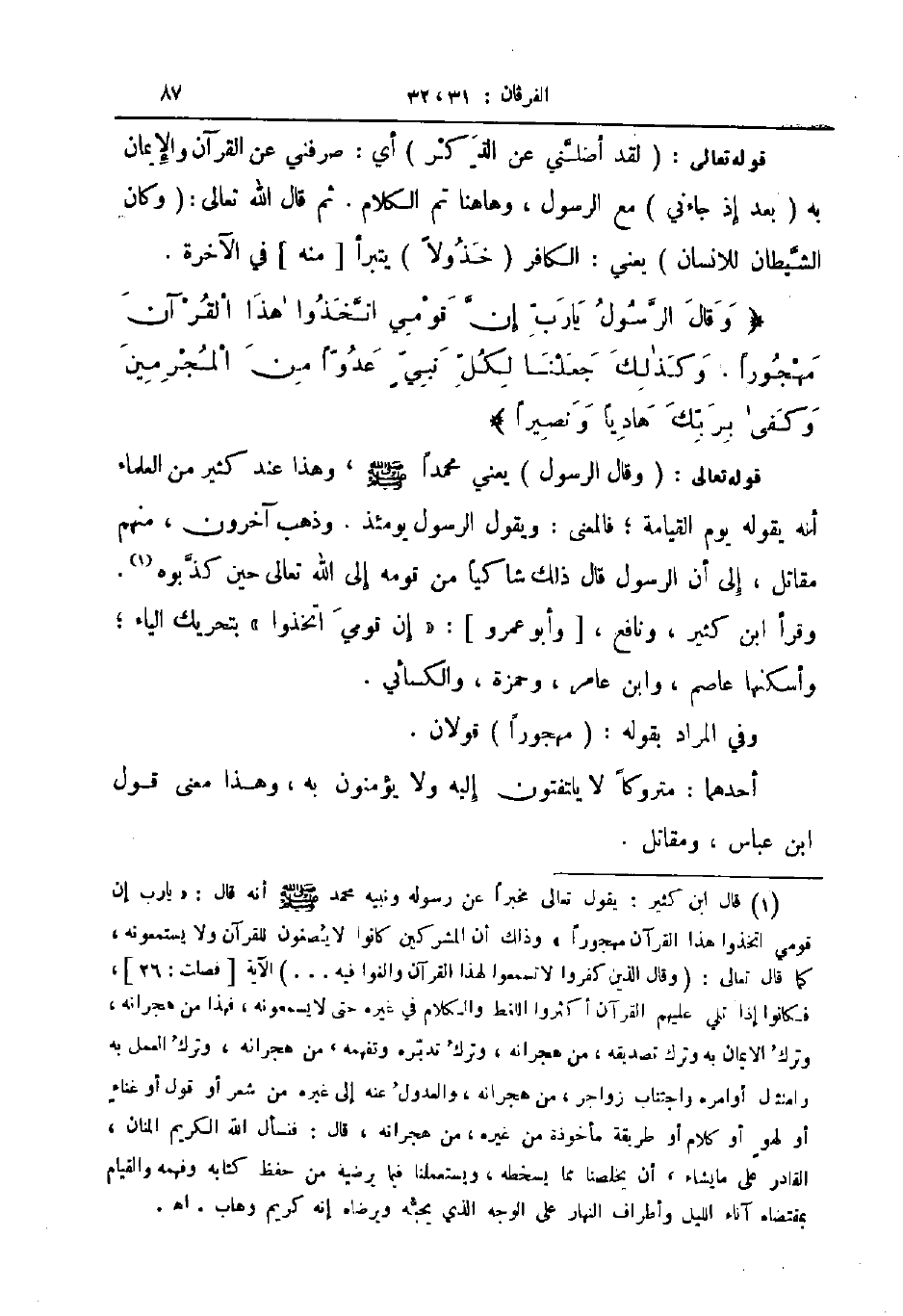 قوله تعالى وقال الرسول يعني محمدا صلى الله عليه و سلم وهذا عند كثير من العلماء أنه يقوله يوم القيامة فالمعنى ويقول الرسول يومئذ وذهب آخرون منهم مقاتل إلى أن الرسول قال ذلك شاكيا من قومه إلى الله تعالى حين كذبوه وقرأ ابن كثير ونافع وأبو عمرو إن قومي اتخذوا بتحريك الياء وأسكنها عاصم وابن عامر وحمزة والكسائي