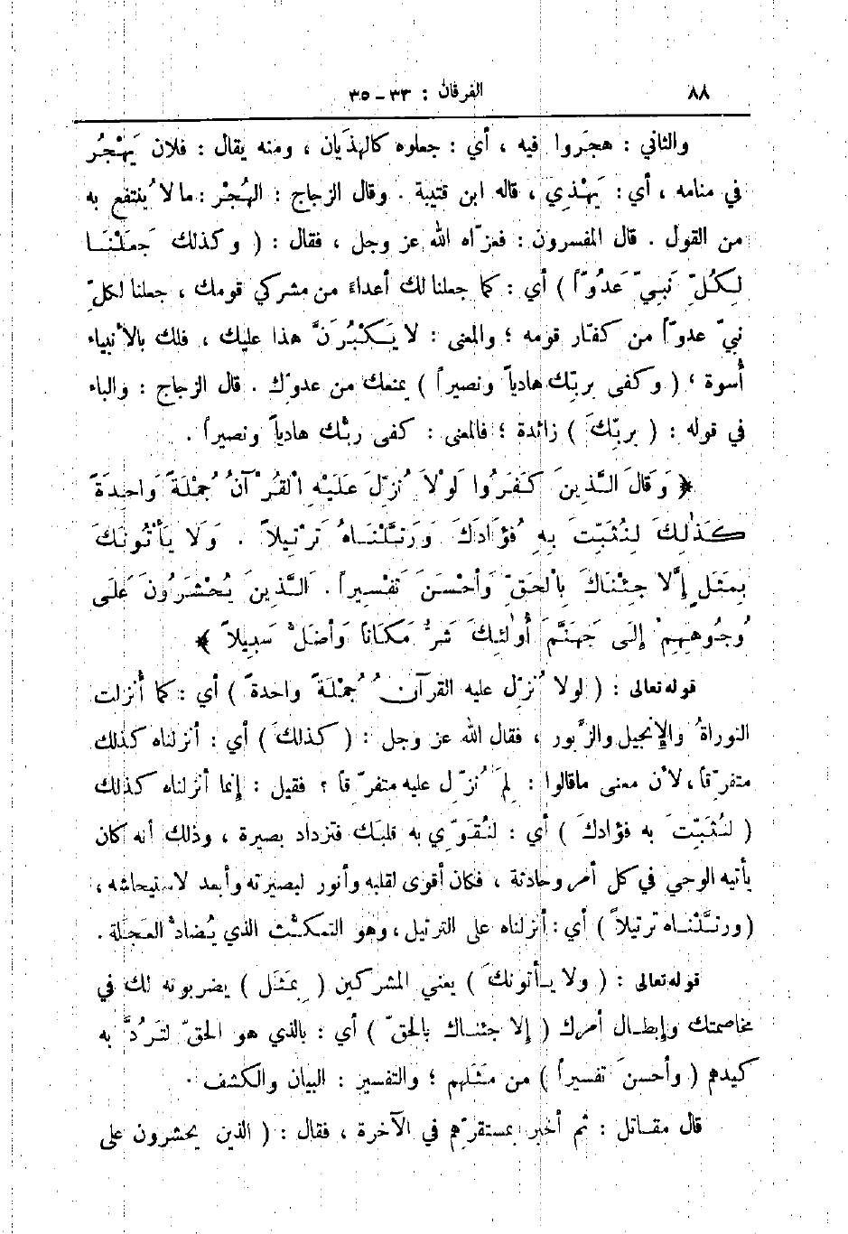 وقال الذين كفروا لو لا نزل عليه القرآن جملة واحدة كذلك لنثبت به فؤادك ورتلناه ترتيلا ولا يأتونك بمثل إلا جئناك بالحق وأحسن تفسيرا الذين يحشرون على وجوههم إلى جهنم أولئك شر مكانا وأضل سبيلا
