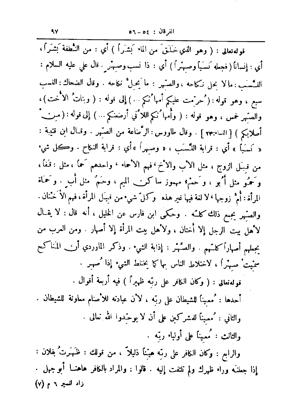 قوله تعالى وهوالذي خلق من الماء بشرا أي من النطفة بشرا أي إنسانا فجعله نسبا وصهرا أي ذا نسب وصهر قال علي عليه السلام النسب ما لا يحل نكاحه والصهر ما يحل نكاحه وقال الضحاك النسب سبع وهو قوله حرمت عليكم أمهاتكم إلى قوله وبنات الأخت والصهر خمس وهو قوله وأمهاتكم الاتي أرضعنكم إلى قوله من أصلابكم وقال طاووس الرضاعة من الصهر وقال ابن قتيبة نسبا اي قرابة النسب وصهرا أي قرابة النكاح وكل شيء من قبل الزوج مثل الأب والأخ فهم الأحماء واحدهم حما مثل قفا وحمو مثل أبو وحممء مهموز ساكن الميم وحم مثل أب وحماة المرأة أم زوجها لا لغة فيها غير هذه وكل شيء من قبل المرأة فهم الأختان والصهر يجمع ذلك كله وحكى ابن فارس عن الخليل أنه قال لا يقال لأهل بيت الرجل إلا أختان ولأهل بيت المرأة إلا أصهار ومن العربمن يجعلهم أصهارا كلهم والصهر إذابة الشيء وذكر الماوردي أن المناكح سميت صهرا لاختلاط الناس بها كما يختلط الشيء إذا صهر