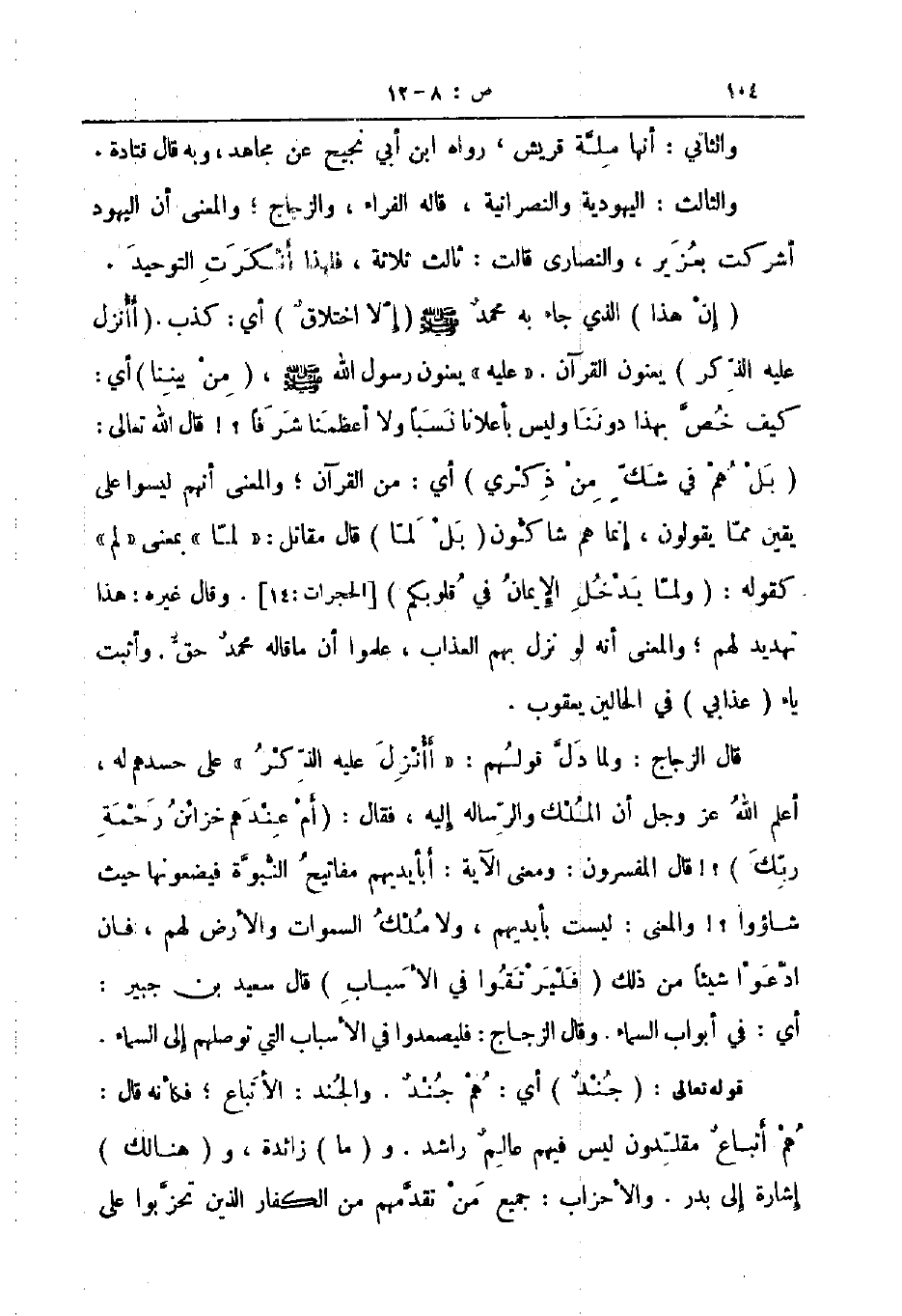 إن هذا الذي جاء به محمد صلى الله عليه و سلم إلا اختلاق أي كذب أأنزل عيه الذكر يعنون القرآن عليه يعنون رسول الله صلى الله عليه و سلم من بيننا أي كيف خص بهذا دوننا وليس بأعلانا نسبا ولا أعظمنا شرفا قال الله تعالى بل هم في شك من ذكري أي من القرآن والمعنى أنهم ليسوا على يقين مما يقولون إنما هم شاكون بل لما قال مقاتل لما بمعنى لم كقوله ولما يدخل الإيمان في قلوبكم الحجرات 14 وقال غيره هذا تهديد لهم والمعنى أنه لو نزل بهم العذاب علموا أن ما قاله محمد حق وأثبت ياء عذابي في الحالين يعقوب