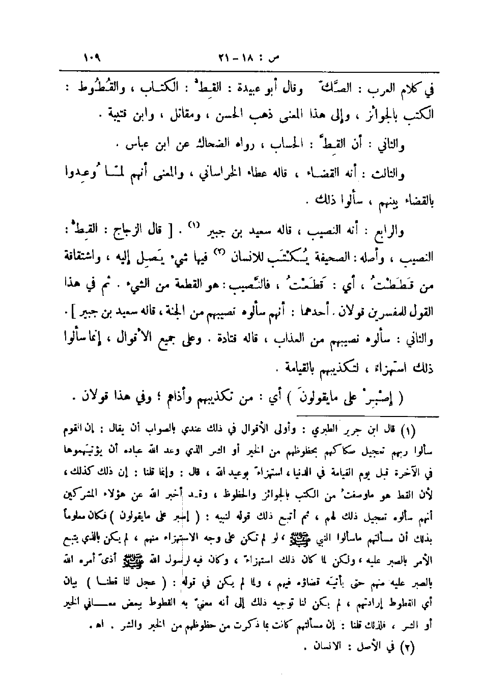 في كلام العرب الصك وقال أبو عبيدة القط الكتاب والقطوط الكتب بالجوائز وإلى هذا المعنى ذهب الحسن ومقاتل وابن قتيبة
