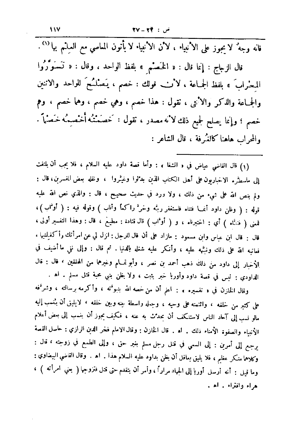 الزجاج إنما قال الخصم بلفظ الواحد وقال تسوروا المحراب بلفظ الجماعة لأن قولك خصم يصلح للواحد والاثنين والجماعة والذكر والأنثى تقول هذا خصم وهي خصم وهما خصم وهم خصم وإنما يصلح لجميع ذلك لأنه مصدر تقول خصمته أخصمه خصما والمحراب هاهنا كالغرفة قال الشاعر