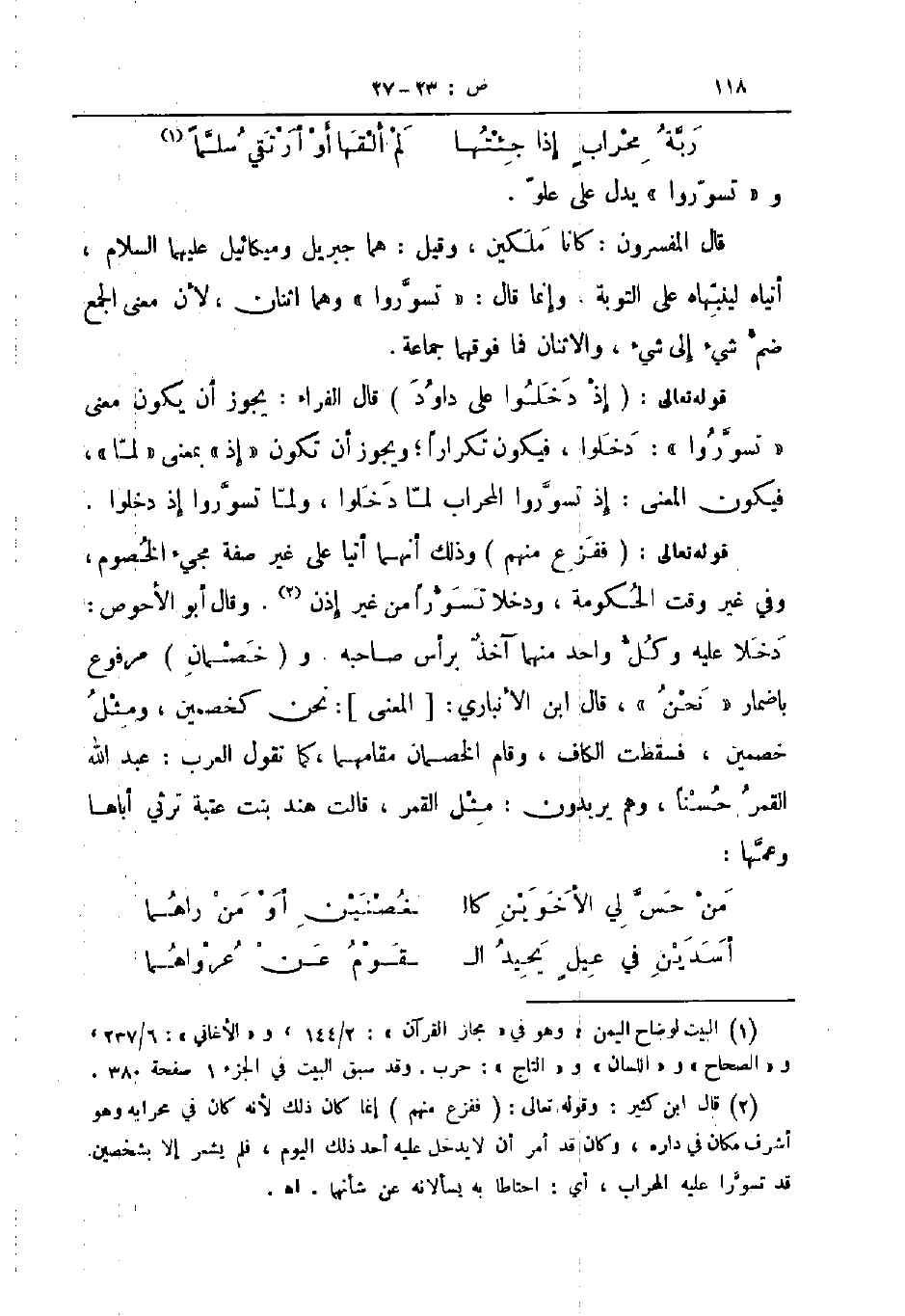 قال المفسرون كانا ملكين وقيل هما جبريل وميكائيل عليهما السلام أتياه لينبهاه على التوبة وإنما قال تسوروا وهما اثنان لأن معنى الجمع ضم شيء إلى شيء والاثنان فما فوقهما جماعة