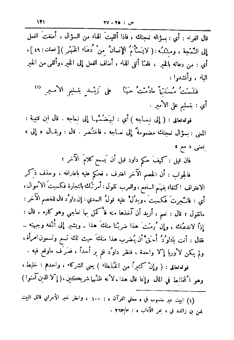 قال الفراء أي بسؤاله نعجتك فاذا ألقيت الهاء من السؤال أضفت الفعل إلى النعجة ومثله لا يسأم الإنسان من دعاء الخير فصلت 49 أي من دعائه بالخير فلما ألقى الهاء أضاف الفعل إلى الخير وألقى من الخير الباء وأنشدوا ... فلست مسلما ما دمت حيا ... على زيد بتسليم الأمير ...