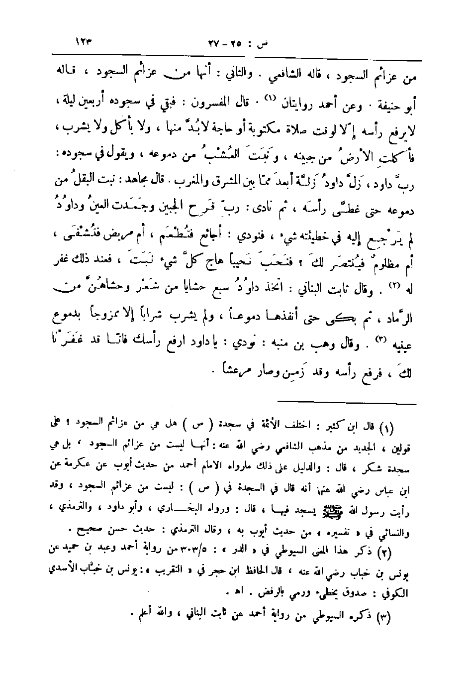 من عزائم السجود قاله الشافعي والثاني أنها من عزائم السجود قاله أبو حنيفة وعن أحمد روايتان قال المفسرون فبقي في سجوده أربعين ليلة لا يرفع رأسه إلا لوقت صلاة مكتوبة أو حاجة لا بد منها ولا يأكل ولا يشرب فأكلت الأرض من جبينه ونبت العشب من دموعه ويقول في سجوده رب داود زل داود زلة أبعد مما بين المشرق والمغرب قال مجاهد نبت البقل من دموعه حتى غطى رأسه ثم نادى رب قرح الجبين وجمدت العين وداود لم يرجع إليه في خطيئته شيء فنودي أجائع فتطعم أم مريض فتشفى أم مظلوم فينتصر لك فنحب نحيبا هاج كل شيء نبت فعند ذلك غفر له وقال ثابت البناني اتخذ داود سبع حشايا من شعر وحشاهن من الرماد ثم بكى حتى أنفذها دموعا ولم يشرب شرابا إلا ممزوجا بدموع عينيه وقال وهب بن منبه نودي يا داود ارفع رأسك فانا قد غفرنا لك فرفع راسه وقد زمن وصار مرعشا