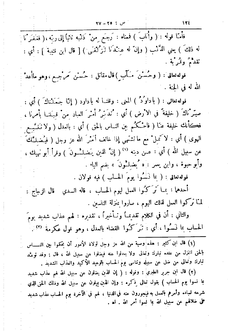 قوله تعالى يا داود المعنى وقلنا له يا داود إنا جعلناك أي صيرناك خليفة في الأرض أي تدبر أمر العباد من قبلنا بأمرنا فكأنك خليفة عنا فاحكم بين الناس بالحق أي بالعدل ولا تتبع الهوى أي لا تمل مع ما تشتهي إذا خالف أمر الله عز و جل فيضلك عن سبيل الله أي عن دينه إن الذين يضلون وقرأ أبو نهيك وأبو حيوة وابن يعمر يضلون بضم الياء