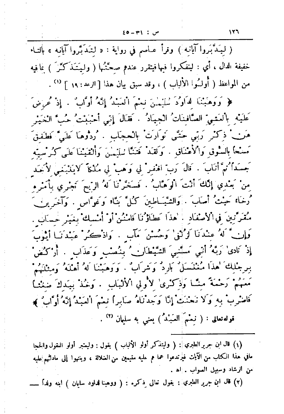 ووهبنا لداود سليمان نعم العبد إنه أواب إذ عرض عليه بالعشي الصافنات الجياد فقال إني أحببت حب الخير عن ذكر ربي حتى توارت بالحجاب ردوها علي فطفق مسحا بالسوق والأعناق ولقد فتنا سليمان وألقينا على كرسيه جسدا ثم أناب قال رب اغفر لي وهب لي ملكا لا ينبغي لأحد من بعدي إنك أنت الوهاب فسخرنا له الريح تجري بأمره رخاء حيث أصاب والشياطين كل بناء وغواص وآخرين مقرنين في الأصفاد هذا عطاؤنا فامنن أو أمسك بغير حساب وإن له عندنا لزلفى وحسن مآب واذكر عبدنا أيوب إذ نادى ربه أني مسني الشيطان بنصب وعذاب أركض برجلك هذا مغتسل بارد وشراب ووهبنا له أهله ومثلهم معهم رحمة منا وذكرى لأولي الألباب وخذ بيدك ضغثا فاضرب به ولا تحنث إنا وجدناه صابرا نعم العبد إنه أواب