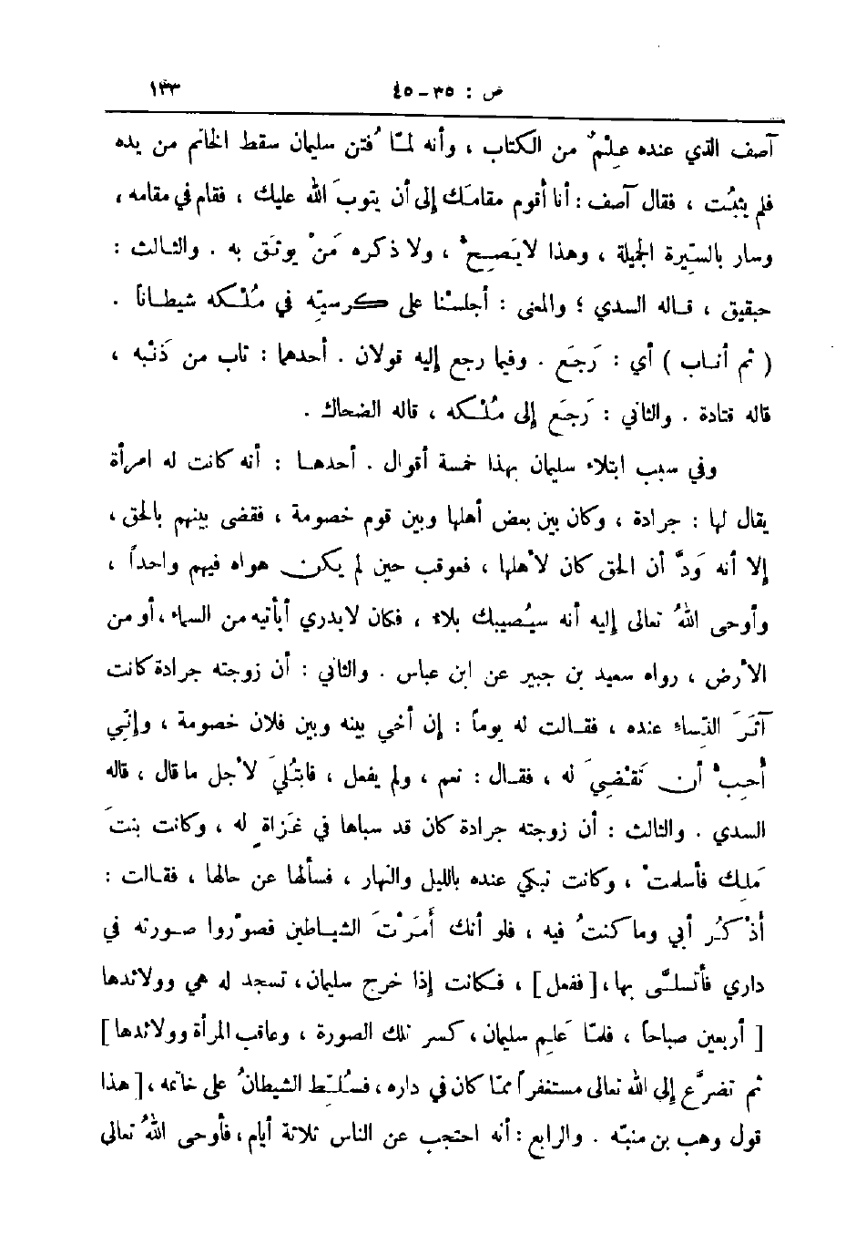 وفي سبب ابتلاء سليمان بهذا خمسة أقوال أحدها أنه كانت له امرأة يقال لها جرادة وكان بين بعض أهلها وبين قوم خصومة فقضى بينهم بالحق إلا أنه ود أن الحق كان لأهلها فعوقب حين لم يكن هواه فيهم واحدا وأوحى الله تعالى إليه أنه سيصيبك بلاء فكان لا يدري أيأتيه من السماء أو من الأرض رواه سعيد بن جبير عن ابن عباس والثاني أن زوجته جرادة كانت آثر النساء عنده فقالت له يوما إن أخي بينه وبين فلان خصومة وإني أحب أن تقضي له فقال نعم ولم يفعل فابتلي لأجل ما قال قاله السدي والثالث أن زوجته جرادة كان قد سباها في غزاة له وكانت بنت ملك فأسلمت وكانت تبكي عنده بالليل والنهار فسألها عن حالها فقالت أذكر أبي وما كنت فيه فلو أنك أمرت الشياطين فصوروا صورته في داري فأتسلى بها ففعل فكانت إذا خرج سليمان تسجد له هي و ولائدها أربعين صباحا فلما علم سليمان كسر تلك الصورة وعاقب المرأة و ولائدها ثم تضرع إلى الله تعالى مستغفرا مما كان في داره فسلط الشيطان على خاتمه هذا قول وهب بن منبه والرابع أنه احتجب عن الناس ثلاث أيام فأوحى الله تعالى