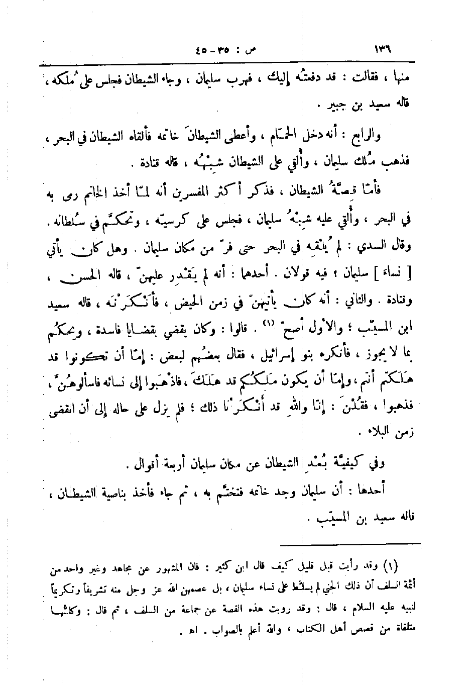 فأما قصة الشيطان فذكر أكثر المفسرين أنه لما أخذ الخاتم رمى به في البحر وألقي عليه شبه سليمان فجلس على كرسيه وتحكم في سلطانه وقال السدي لم يلقه في البحر حتى فر من مكان سليمان وهل كان يأتي نساء سليمان فيه قولان أحدهما أنه لم يقدر عليهن قاله الحسن وقتادة والثاني أنه كان يأتيهن في زمن الحيض فأنكرنه قاله سعيد ابن المسيب والأول أصح قالوا وكان يقضي بقضايا فاسدة ويحكم بما لا يجوز فأنكره بنو إسرائيل فقال بعضهم لبعض إما أن تكونوا قد هلكتم أنتم وإما أن يكون ملككم قد هلك فاذهبوا إلى نسائه فاسألوهن فذهبوا فقلن إنا والله قد أنكرنا ذلك فلم يزل على حاله إلى أن انقضى زمن البلاء