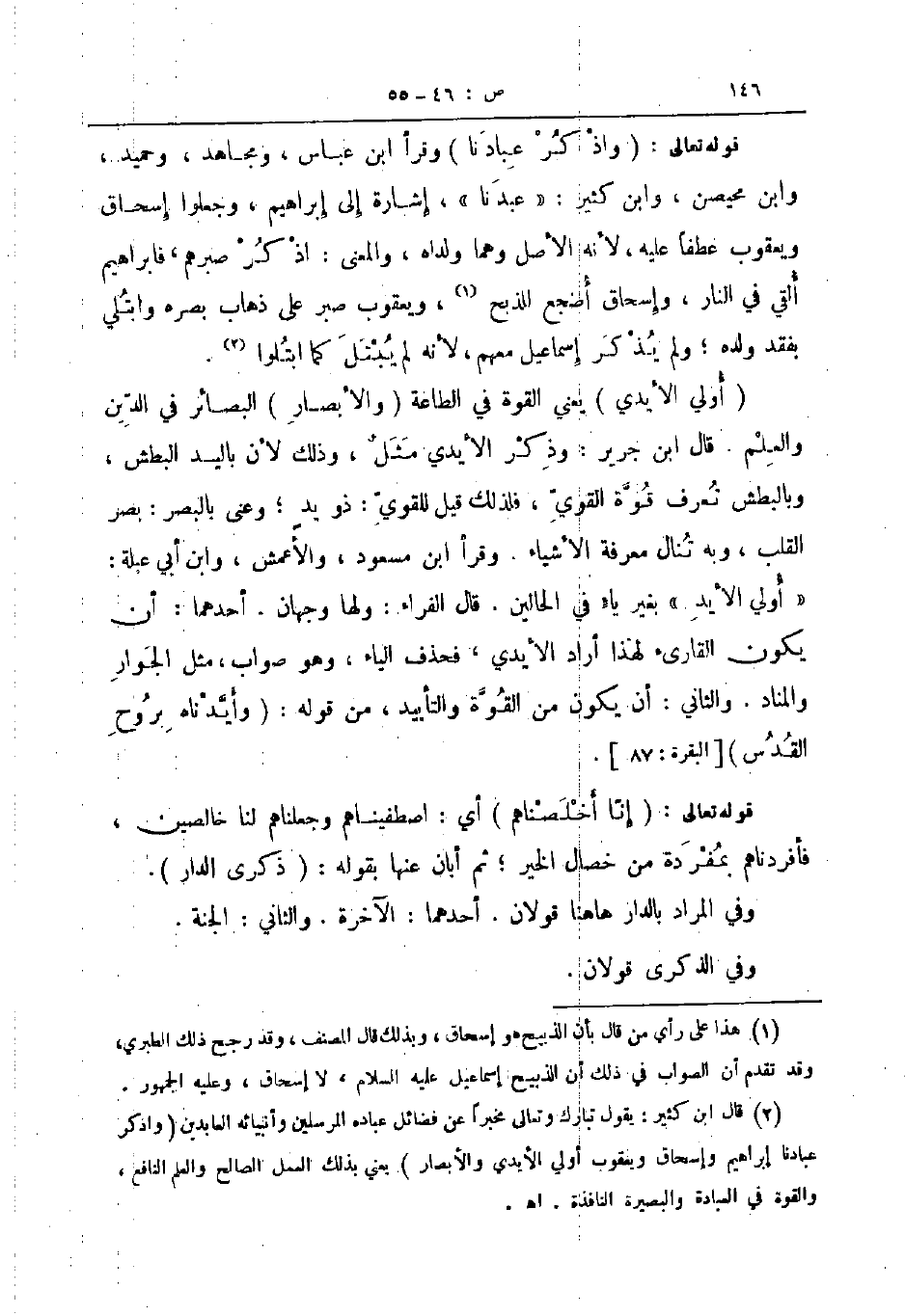 أولي الأيدي يعني القوة في الطاعة والأبصار البصائر في الدين والعلم قال ابن جرير وذكر الأيدي مثل وذلك لأن باليد البطش وبالبطش تعرف قوة القوي فلذلك قيل للقوي ذو يد وعنى بالبصر بصر القلب وبه تنال معرفة الأشياء وقرأ ابن مسعود والأعمش وابن أبي عبلة أولي الأيد بغير ياء في الحالين قال الفراء ولها وجهان أحدهما أن يكون القارئ لهذا أراد الأيدي فحذف الياء وهو صواب مثل الجوار والمناد والثاني أن يكون من القوة والتأييد من قوله وأيدناه بروح القدس البقرة 87