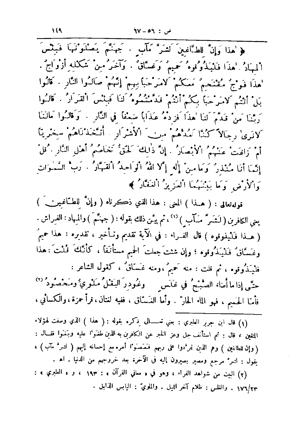 قوله تعالى هذا المعنى هذا الذي ذكرناه وإن للطاغين يعني الكافرين لشر مآب ثم بين ذلك بقوله جهنم والمهاد الفراش هذا فليذوقوه قال الفراء في الآية تقديم وتأخير تقديره هذا حميم وغساق فليذوقوه وإن شئت جعلت الحميم مستأنفا كأنك قلت هذا فليذوقوه ثم قلت منه حميم ومنه غساق كقول الشاعر ... حتى إذا ما أضاء الصبح في غلس ... وغودر البقل ملوي ومحصود ...