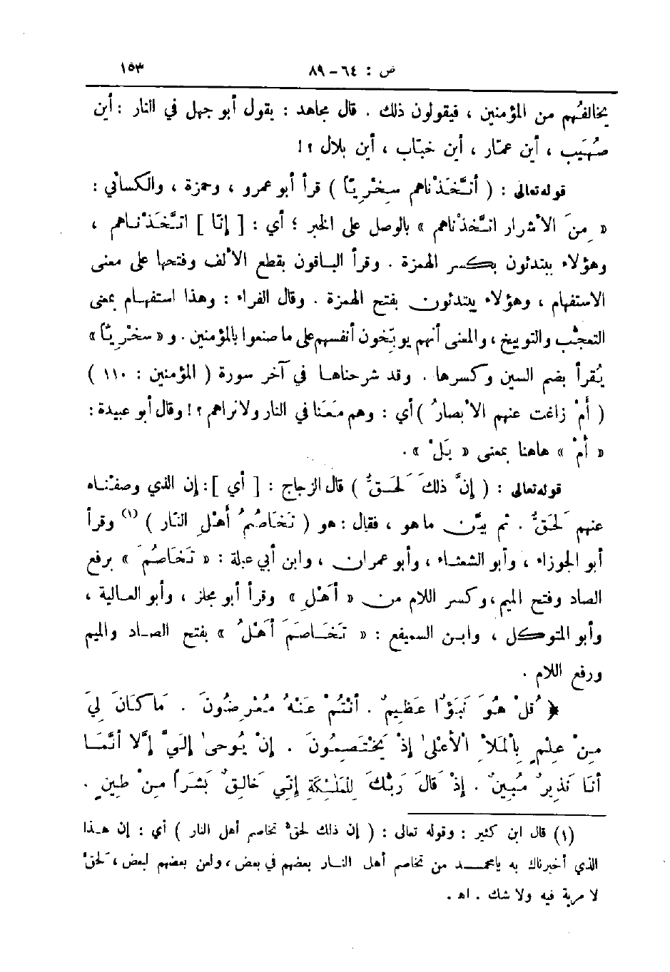 قوله تعالى إن ذلك لحق قال الزجاج أي إن الذي وصفناه عنهم لحق ثم بين ما هو فقال هو تخاصم أهل النار وقرأ أبوالجوزاء وأبو الشعثاء وأبو عمران وابن أبي عبلة تخاصم برفع الصاد وفتح الميم وكسر اللام من أهل وقرأ أبو مجلز وأبو العالية وأبو المتوكل وابن السميفع تخاصم أهل بفتح الصاد والميم ورفع اللام