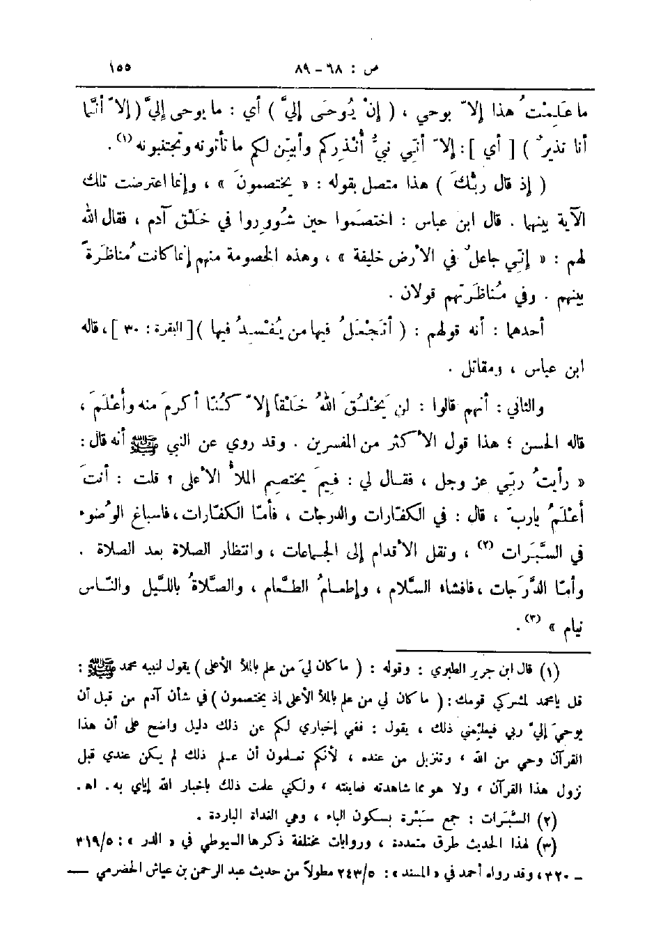 والثاني أنهم قالوا لن يخلق الله خلقا إلا كنا أكرم منه وأعلم قاله الحسن هذا قول الأكثر من المفسرين وقد روي عن النبي صلى الله عليه و سلم أنه قال رأيت ربي عز و جل فقال لي فيم يختصم الملأ الأعلى قلت أنت أعلم يارب قال في الكفارات والدرجات فأما الكفارات فاسباغ الوضوء في السبرات ونقل الأقدام إلى الجماعات وانتظار الصلاة بعد الصلاة وأما الدرجات فافشاء السلام وإطعام الطعام والصلاة بالليل والناس نيام