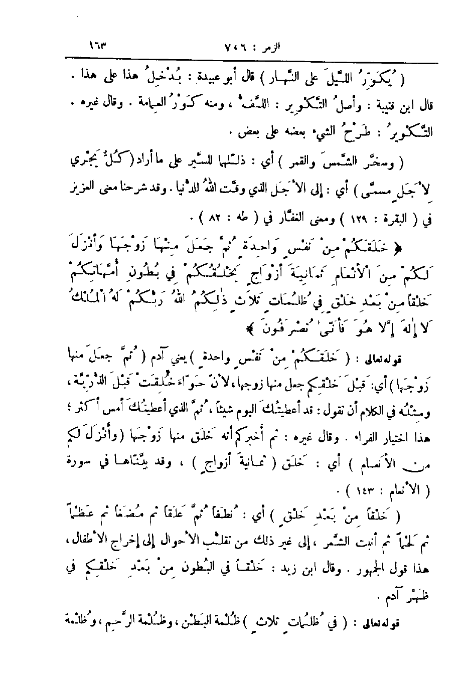 قوله تعالى خلقكم من نفس واحدة يعني آدم ثم جعل منها زوجها أي قبل خلقكم جعل منها زوجها لأن حواء خلقت قبل الذرية ومثله في الكلام أن تقول قد أعطيتك اليوم شيئا ثم الذي أعطيتك أمس أكثر هذا اختيار الفراء وقال غيره ثم أخبركم أنه خلق منها زوجها وأنزل لكم من الأنعام أي خلق ثمانية أزواج وقد بيناها في سورة الأنعام 143