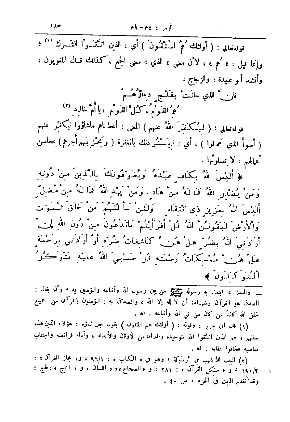 قوله تعالى أولئك هم المتقون أي الذين اتقوا الشرك وإنما قيل هم لأن معنى الذي معنى الجمع كذلك قال اللغويون وأنشد أبو عبيدة والزجاج ... فان الذي حانت بفلج دماؤهم ... هم القوم كل القوم يا أم خالد ...