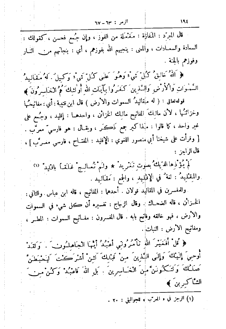 قوله تعالى له مقاليد السموات والأرض قال ابن قتيبة أي مفاتيحها وخزائنها لأن مالك المفاتيح مالك الخزائن واحدها إقليد وجمع على غير واحد كما قالوا مذاكير جمع ذكر ويقال هو فارسي معرب وقرأت على شيخنا أبي منصور اللغوي الإقليد المفتاح فارسي معرب قال الراجز ... لم يؤذها الديك بصوت تغريد ... ولم تعالج غلقا باقليد ...