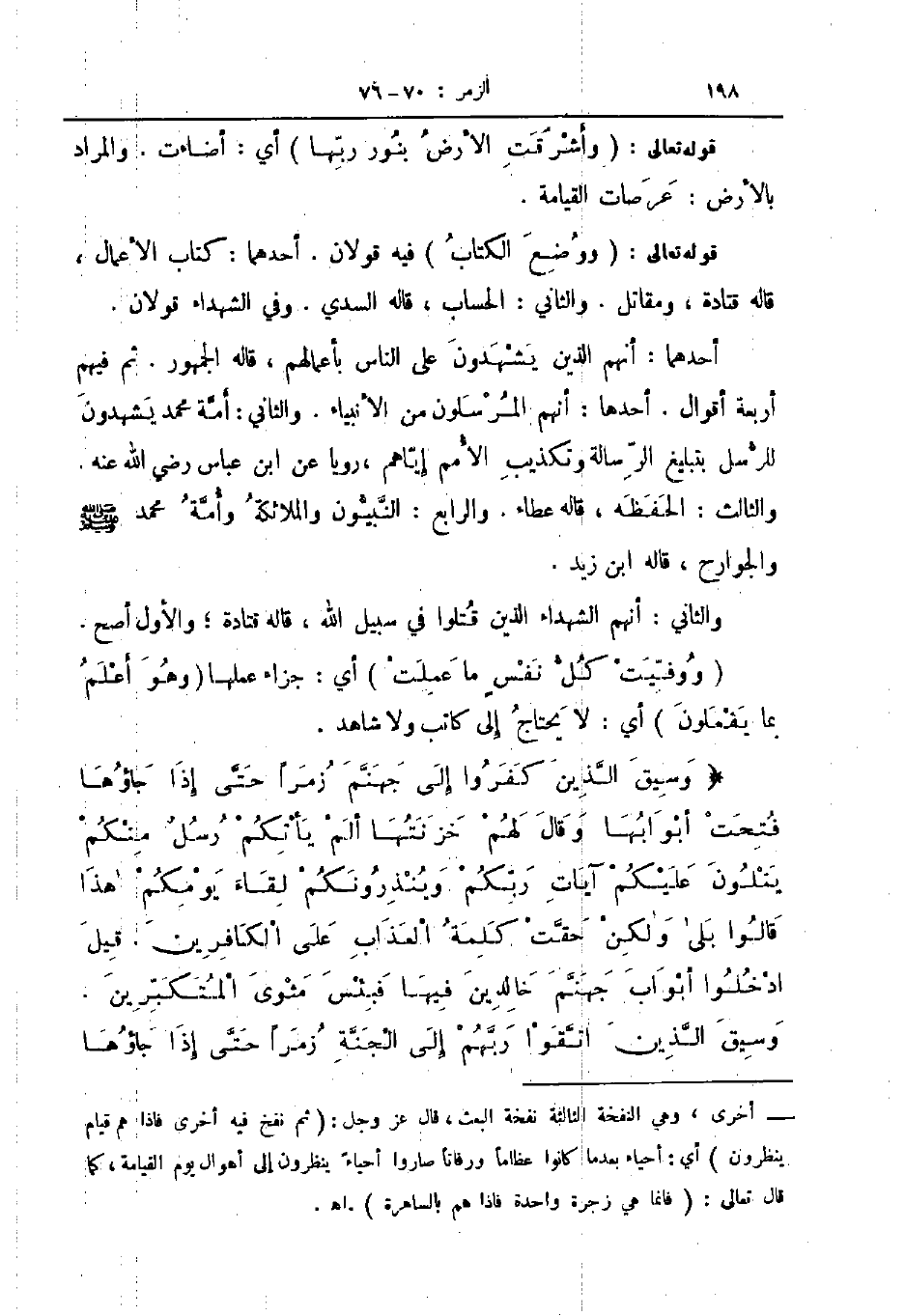 وسيق الذين كفروا إلى جهنم زمرا حتى إذا جاؤها فتحت أبوابها وقال لهم خزنتها ألم يأتكم رسل منكم يتلون عليكم آيات ربكم وينذرونكم لقاء يومكم هذا قالوا بلى ولكن حقت كلمة العذاب على الكافرين قيل ادخلوا أبواب جهنم خالدين فيها فبئس مثوى المتكبرين وسيق الذين اتقوا ربهم إلى الجنة زمرا حتى إذا جاؤها