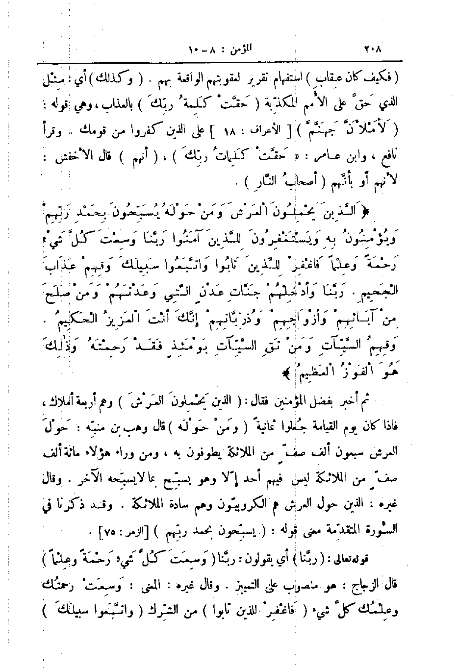 الذين يحملون العرش ومن حوله يسبحون بحمد ربهم ويؤمنون به ويستغفرون للذين آمنوا ربنا وسعت كل شيء رحمة وعلما فاغفر للذين تابوا واتبعوا سبيلك وقهم عذاب الجحيم ربنا وأدخلهم جنات عدن التي وعدتهم ومن صلح من آبائهم وأزواجهم وذرياتهم إنك أنت العزيز الحكيم وقهم السيآت ومن تق السيئات يومئذ فقد رحمته وذلك هو الفوزالعظيم