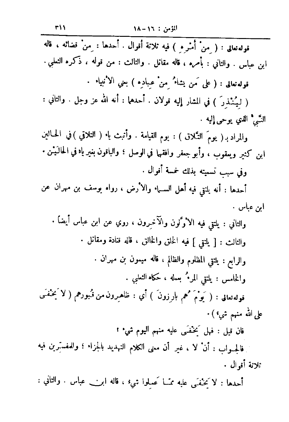 والمراد ب يوم التلاق يوم القيامة وأثبت ياء التلاقي في الحالين ابن كثير ويعقوب وأبو جعفر وافقهما في الوصل والباقون بغير ياء في الحالين وفي سبب تسميته بذلك خمسة أقوال