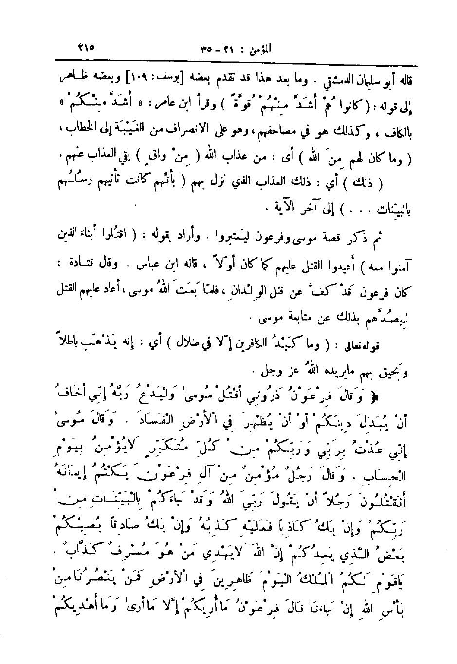 وقال فرعون ذروني أقتل موسى وليدع ربه إني أخاف أن يبدل دينكم أو أن يظهر في الأرض الفساد وقال موسى أني عذت بربي وربكم من كل متكبر لا يؤمن بيوم الحساب وقال رجل مؤمن من آل فرعون يكتم إيمانه أتقتلون رجلا أن يقول ربي الله وقد جاءكم بالبينات من ربكم وإن يك كاذبا فعليه كذبه وإن يك صادقا يصبكم بعض الذي يعدكم إن الله لا يهدي من هو مسرف كذاب يا قوم لكم الملك اليوم ظاهرين في الأرض فمن ينصرنا من بأس الله إن جاءنا قال فرعون ما أريكم إلا ما أرى وما أهديكم