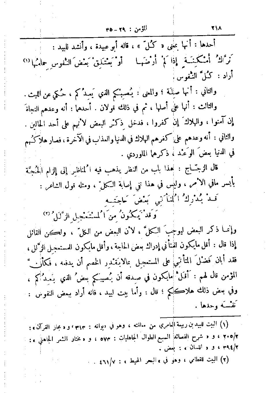 وإنما ذكر البعض ليوجب الكل لأن البعض من الكل ولكن القائل إذا قال أقل ما يكون للمتأني إدراك بعض الحاجة وأقل ما يكون للمستعجل الزلل فقد أبان فضل المتأني على المستعجل بما لا يقدر الخصم أن يدفعه فكأن المؤمن قال لهم أقل ما يكون في صدقة أن يصبكم بعض الذي يعدكم وفي بعض ذلك هلاككم قال وأما بيت لبيد فإنه أراد ببعض النفوس نفسه وحدها